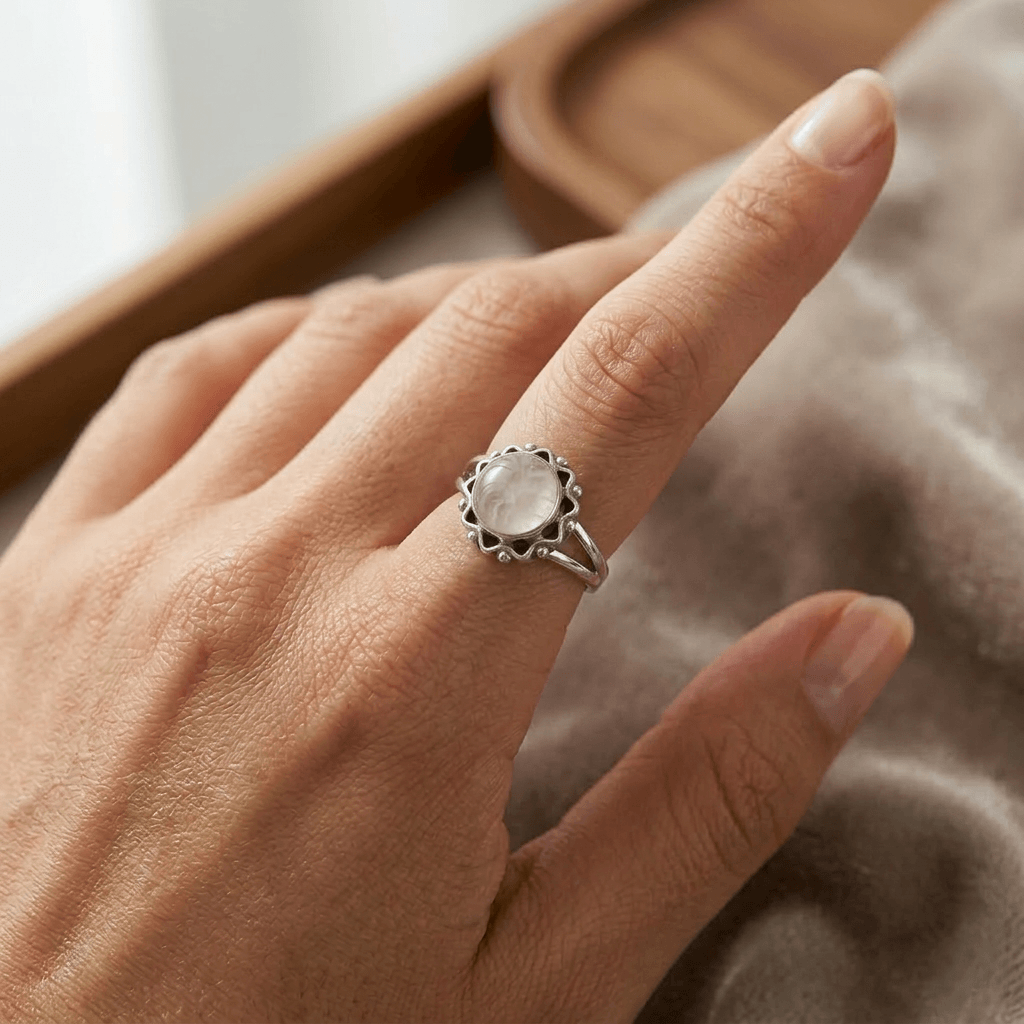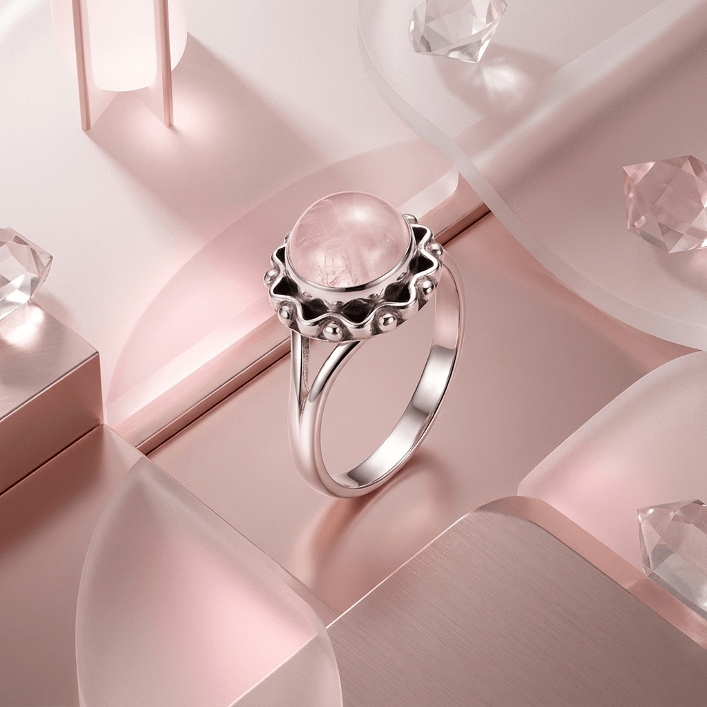 Anel Aura é uma celebração da delicadeza e do autocuidado. Com uma pedra natural de Quartzo Rosa em lapidação cabochão, esta joia exibe um tom rosa pastel suave e translúcido, conhecido mundialmente como a pedra do amor incondicional e da cura emocional.