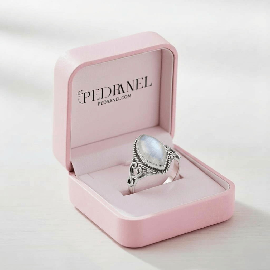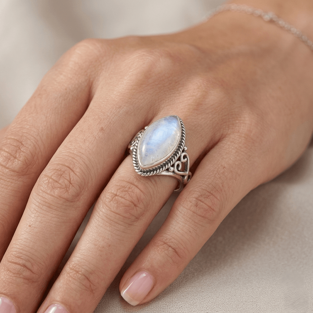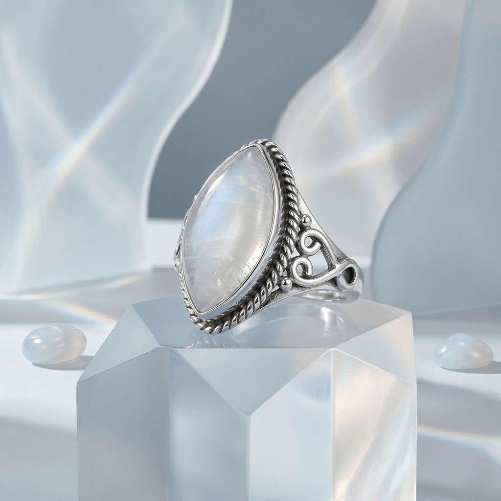 A Pedra: Uma magnífica Pedra da Lua em lapidação marquise, que revela flashes azulados e leitosos conforme o movimento das mãos — o fenômeno místico da adularescência.