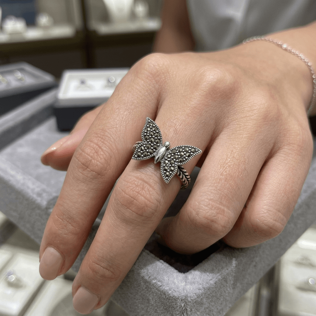 Anel Metamorfose de Marcassita, uma joia que une o simbolismo da liberdade à elegância eterna do estilo vintage. Confeccionado em Prata 925 legítima, este anel apresenta uma borboleta meticulosamente cravejada com marcassitas, conhecidas por seu brilho metálico sutil e hipnotizante.