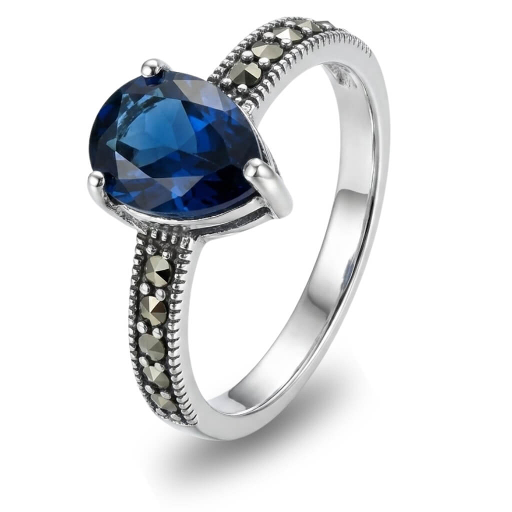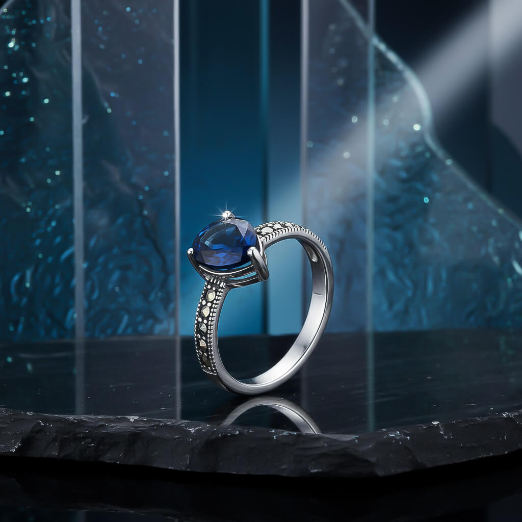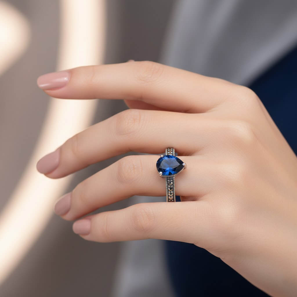 Anel Nobreza Carmim, Confeccionado em Prata 925 de alta qualidade, este anel apresenta um acabamento polido que realça a beleza do metal nobre. O destaque fica por conta da pedra central em lapidação gota, emoldurada por detalhes minuciosos no aro que conferem um ar de realeza à peça.