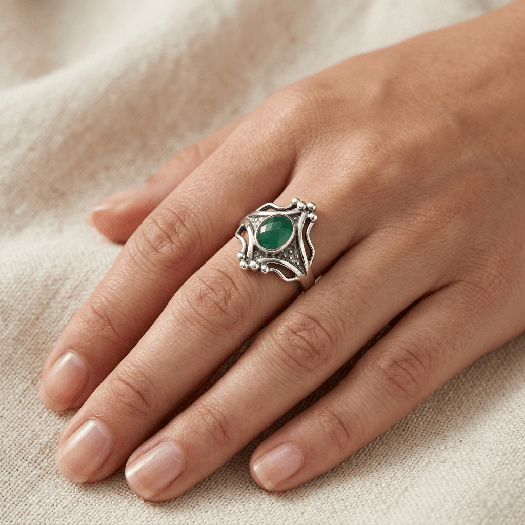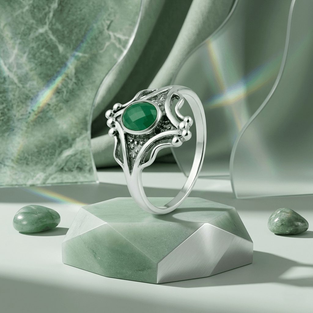 No centro, uma pedra de tonalidade verde profunda — lapidada com precisão para capturar a luz sob todos os ângulos — remete à serenidade das copas das árvores e ao frescor das manhãs. É a peça ideal para quem busca uma conexão com o natural sem abrir mão do estilo refinado.