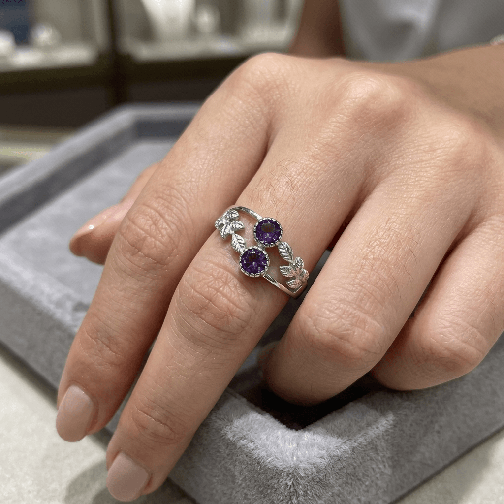 • Dueto de Ametistas: Duas gemas centrais em tom violeta profundo representam gotas de orvalho, trazendo um brilho místico e sereno à peça.