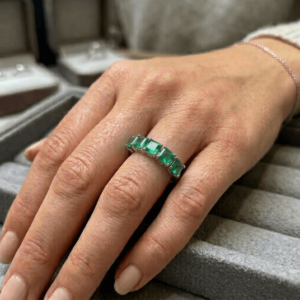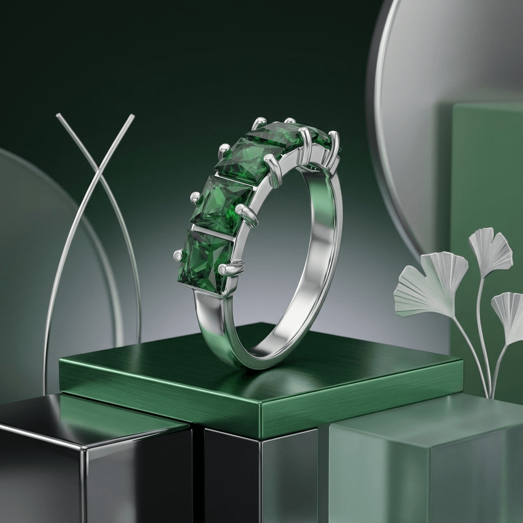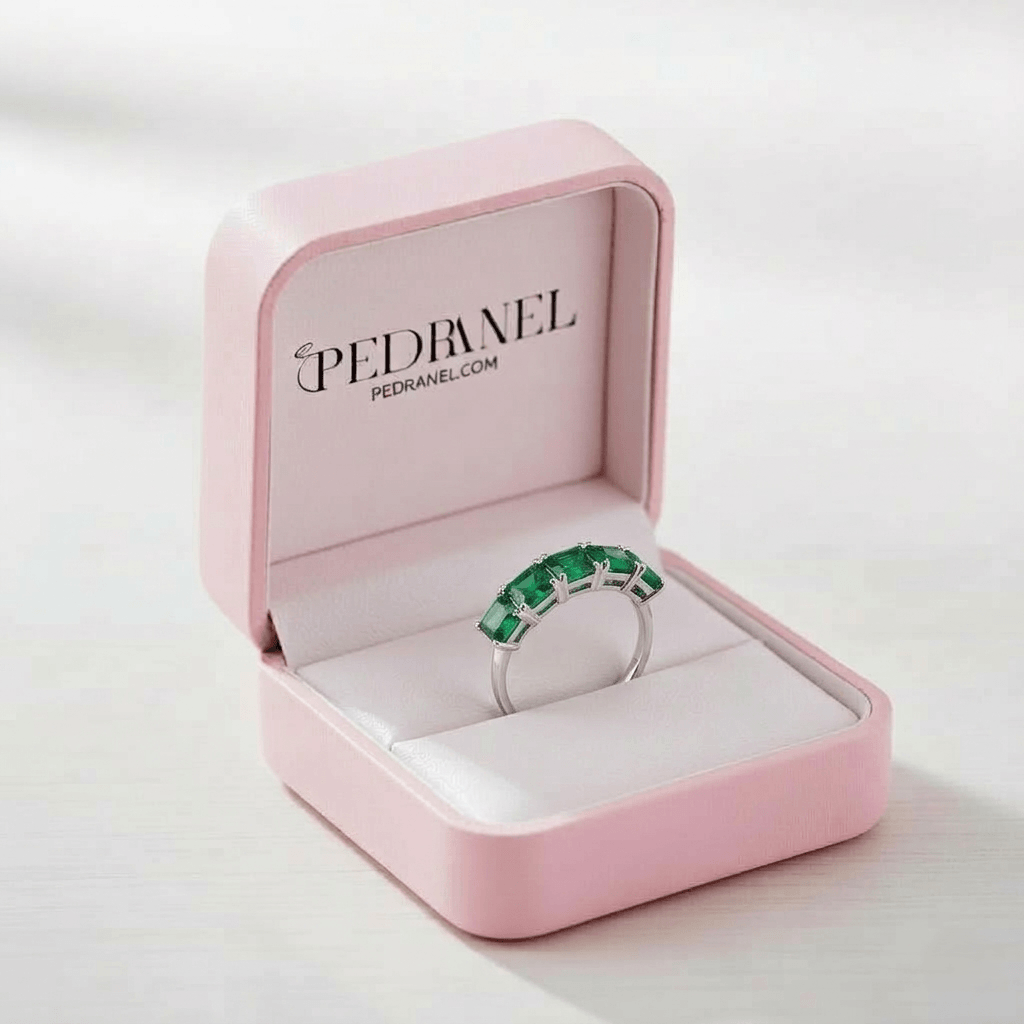 O Anel Pedra Verde Relva da Pedranel é uma celebração à elegância atemporal. Confeccionado em Prata 925 de alta pureza, este modelo estilo meia-aliança apresenta cinco zircônias em lapidação princess (quadrada), que capturam a luz de todos os ângulos.