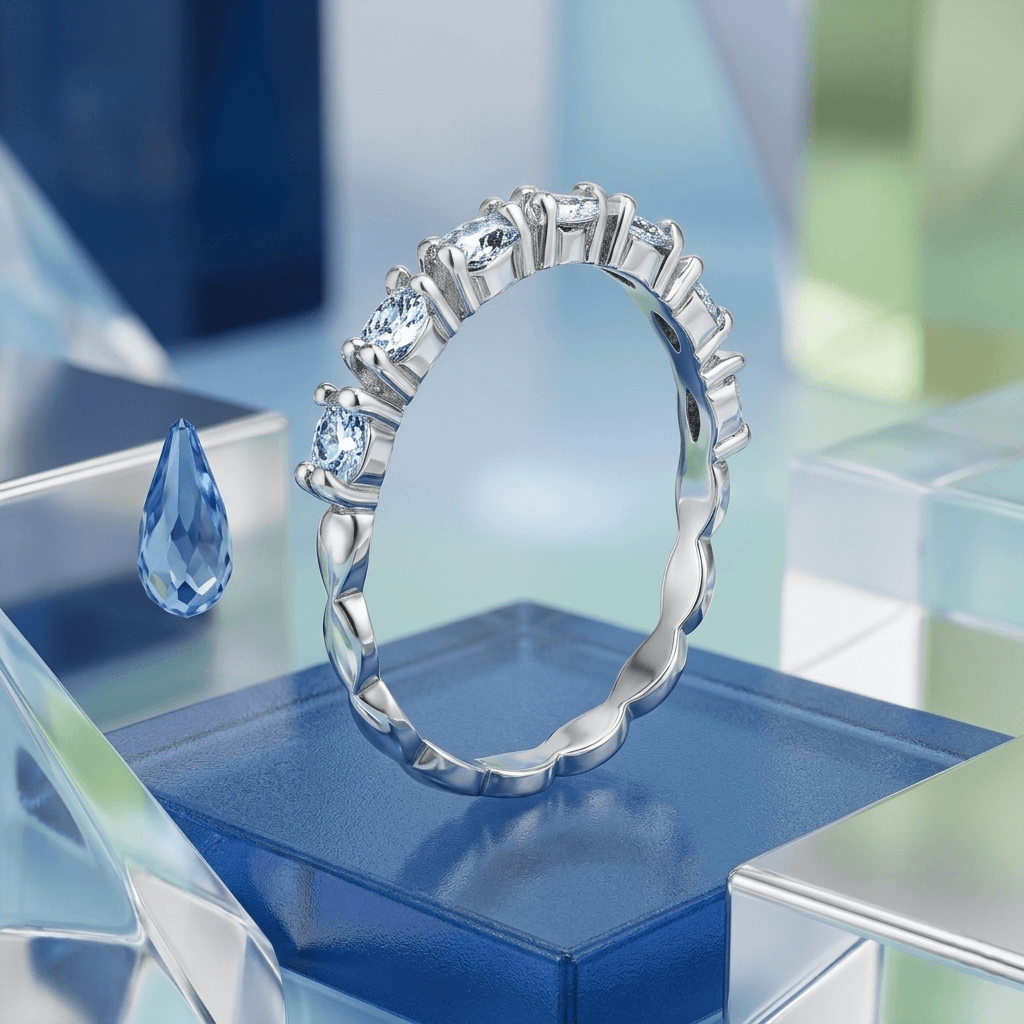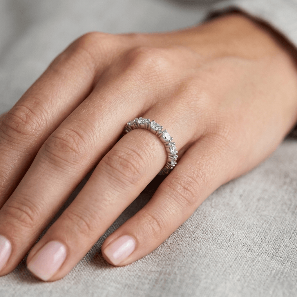 O Anel Riviera Meia Volta destaca-se pelo cravejamento impecável de zircônias premium, selecionadas para refletir a luz de forma intensa e contínua.