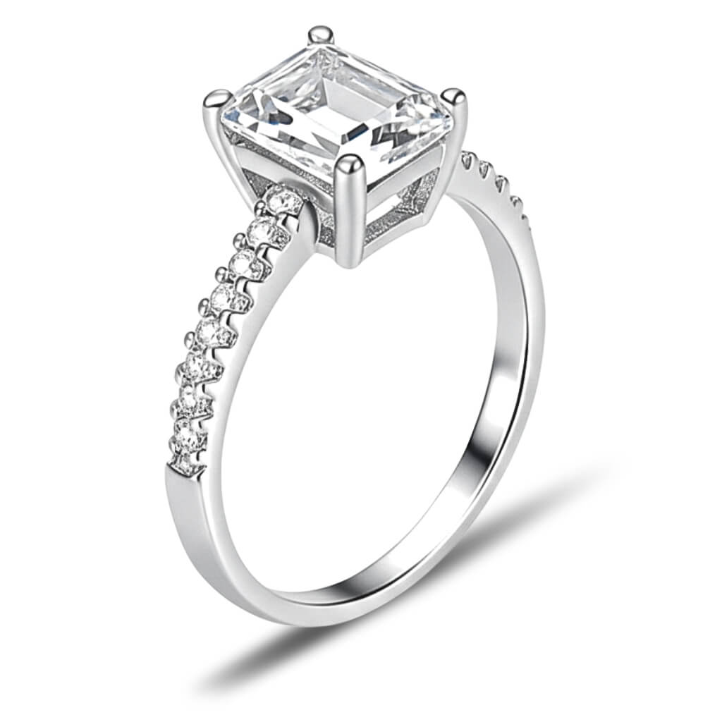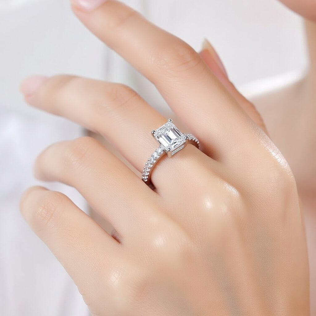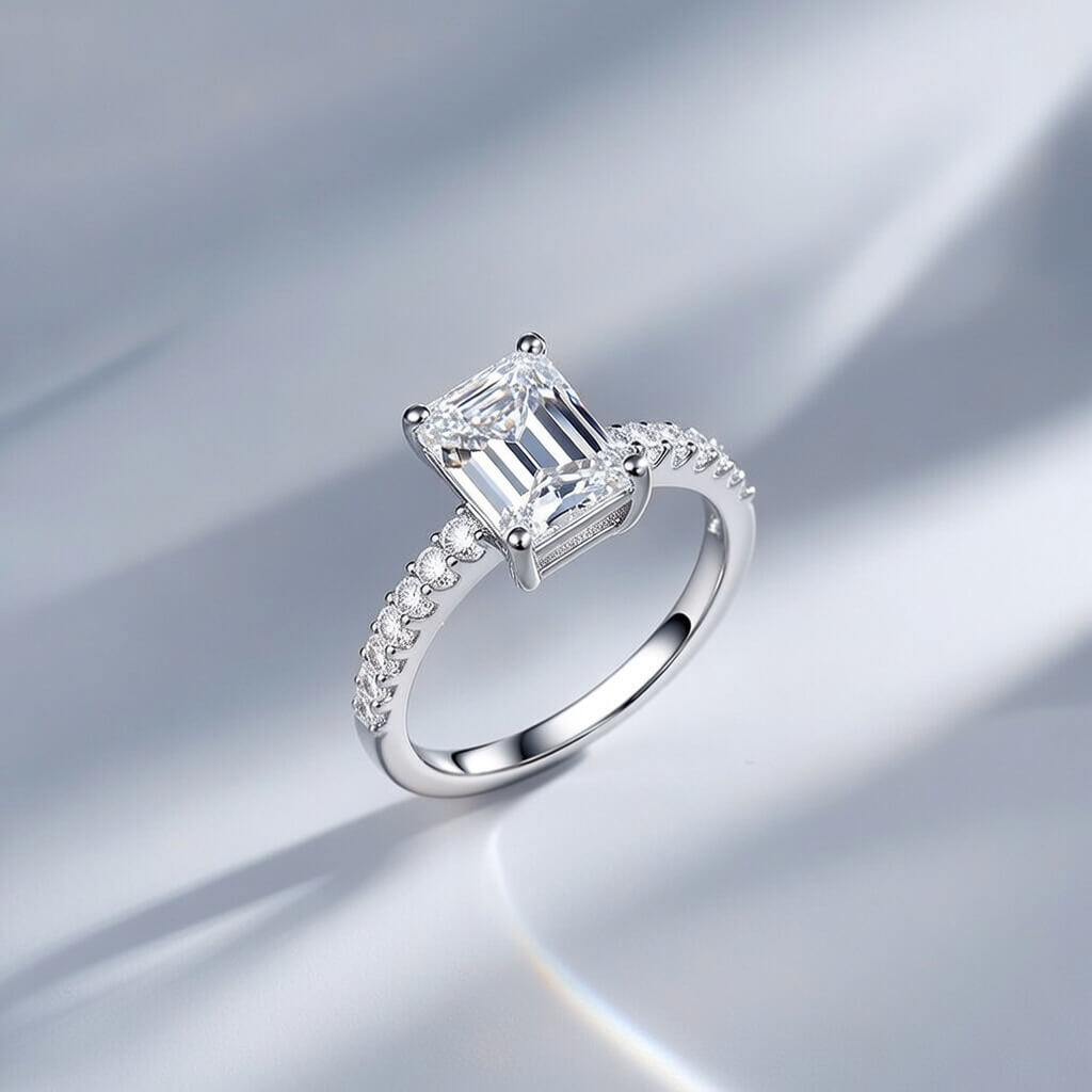 Anel Simetria do Desejo é uma celebração da precisão: sua pedra central com lapidação emerald cut (corte esmeralda) reflete a luz em camadas, criando um efeito de “espelhos infinitos” que hipnotiza o olhar.