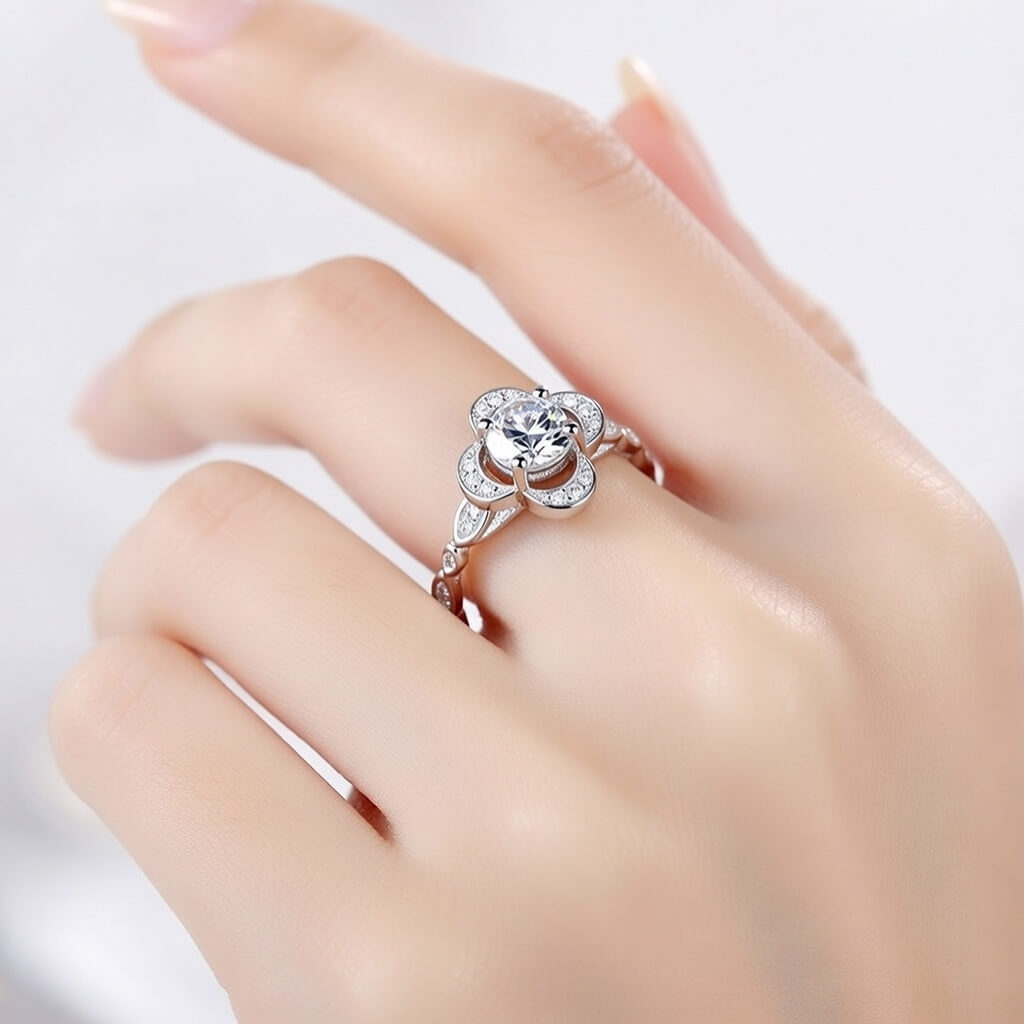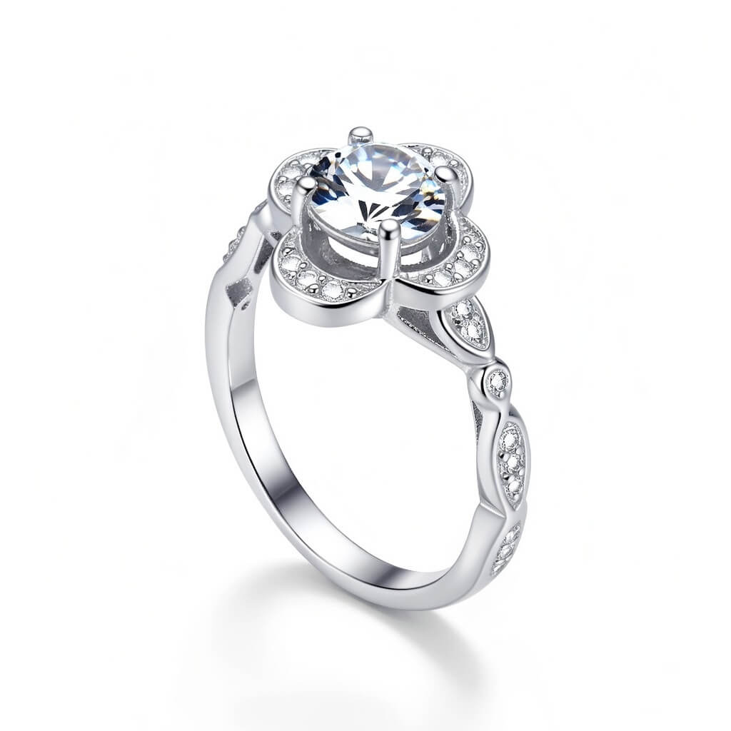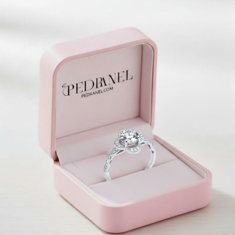 Anel Solitário Flor de Cerejeira da Pedranel é uma celebração da feminilidade e do romantismo. Inspirado na suavidade das flores, este modelo apresenta uma zircônia central imponente, abraçada por quatro pétalas arredondadas e delicadamente cravejadas que formam uma moldura de luz radiante. O grande diferencial está em seu aro trabalhado com detalhes que remetem a pequenas folhas, conferindo um toque de exclusividade e um ar de alta joalheria à peça.