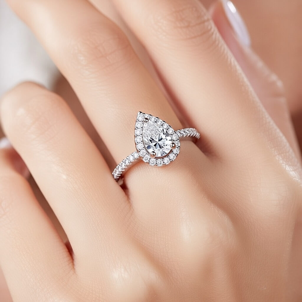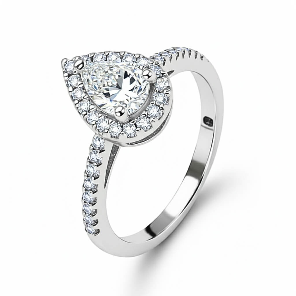 Anel Solitário Gota de Brilhante, uma joia que combina a delicadeza do corte clássico com o brilho intenso da alta joalheria. Confeccionado em Prata 925 de lei, este modelo apresenta uma pedra central em formato de gota (pear cut), cercada por um deslumbrante halo de microzircônias que amplifica sua luminosidade.