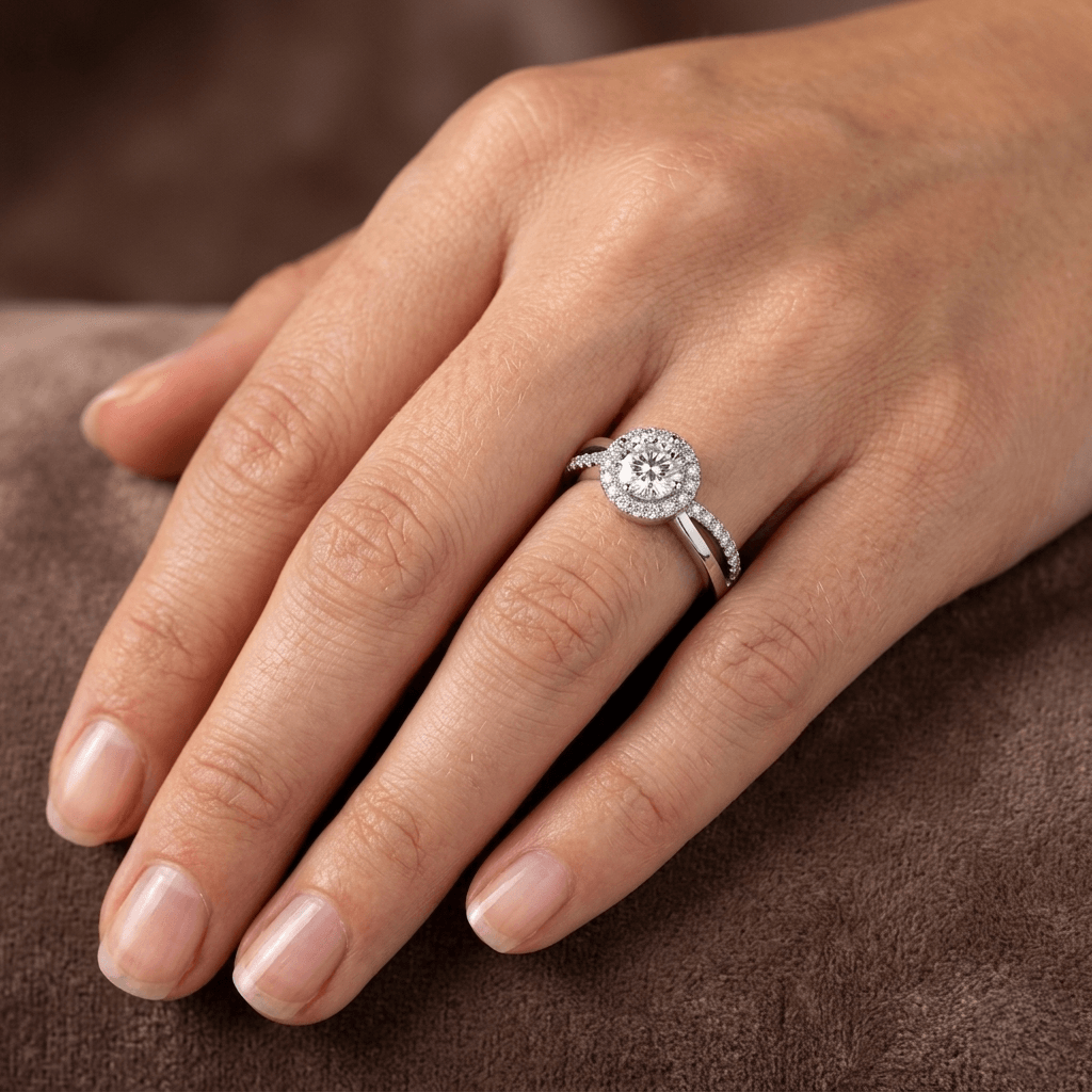 Design: Aro bipartido com cravação pavê e coroa estilo Halo.