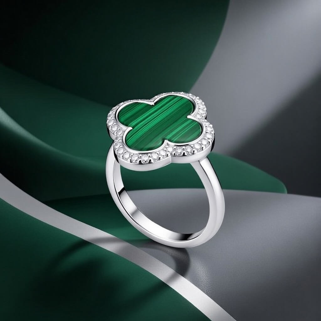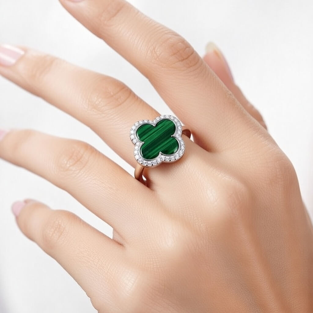 Anel Trevo Fortune, uma joia inspirada no design icônico quatrefoil, símbolo universal de sorte, saúde e fortuna. Confeccionado em Prata 925 de alta qualidade, este anel destaca-se pela sua gema central em tom verde profundo, que remete à sofisticação da malaquita.