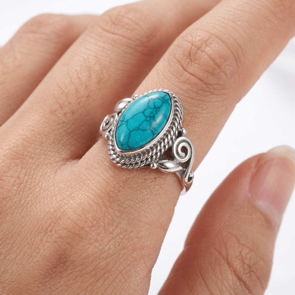 • Gema Central: Uma Turquesa oval autêntica, com suas icônicas variações de tons e veios naturais que tornam cada anel uma peça única.