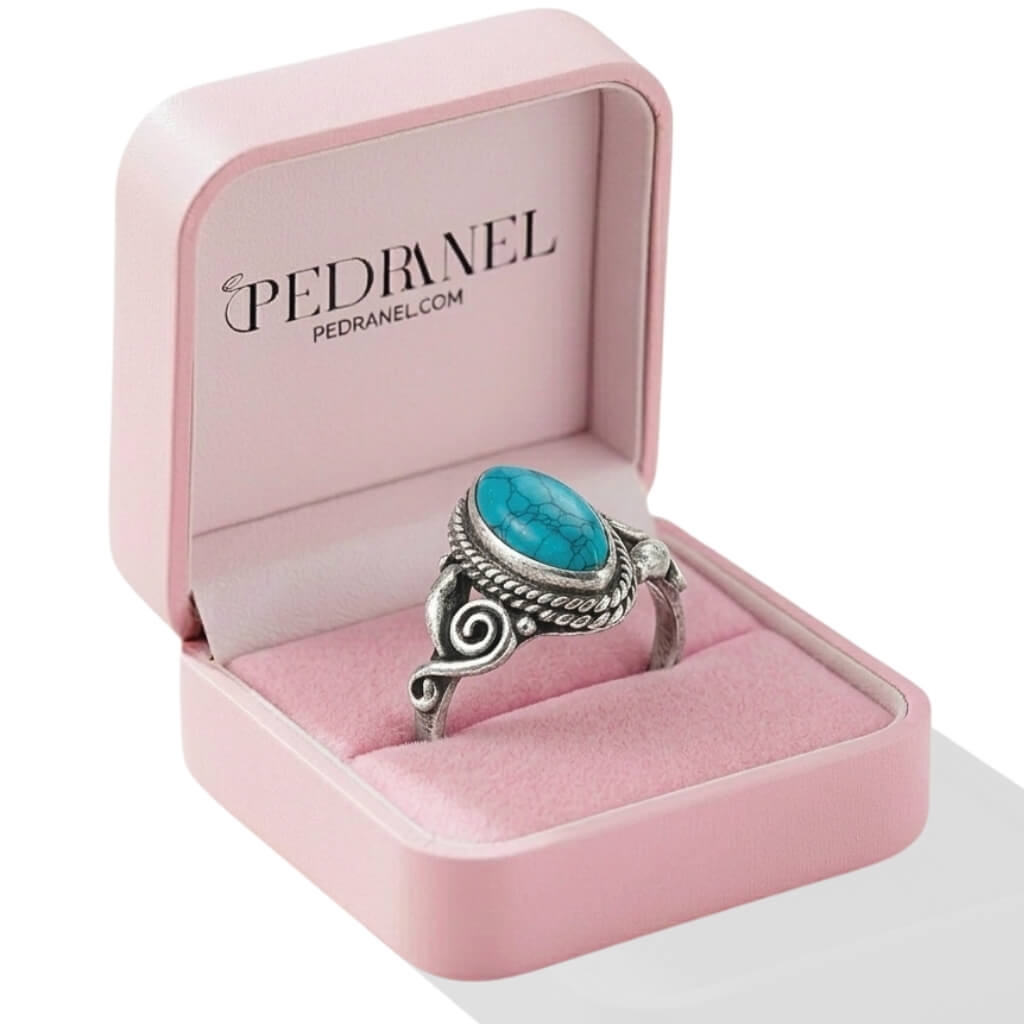 O Anel Turquesa Native da Pedranel é uma peça de presença, fundida em Prata 925 de alta qualidade, garantindo durabilidade e um brilho eterno.