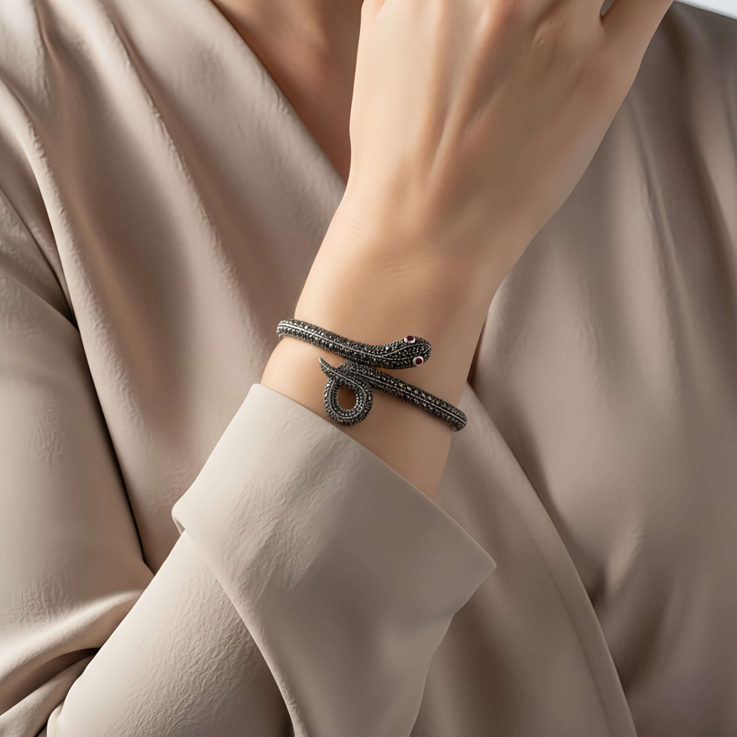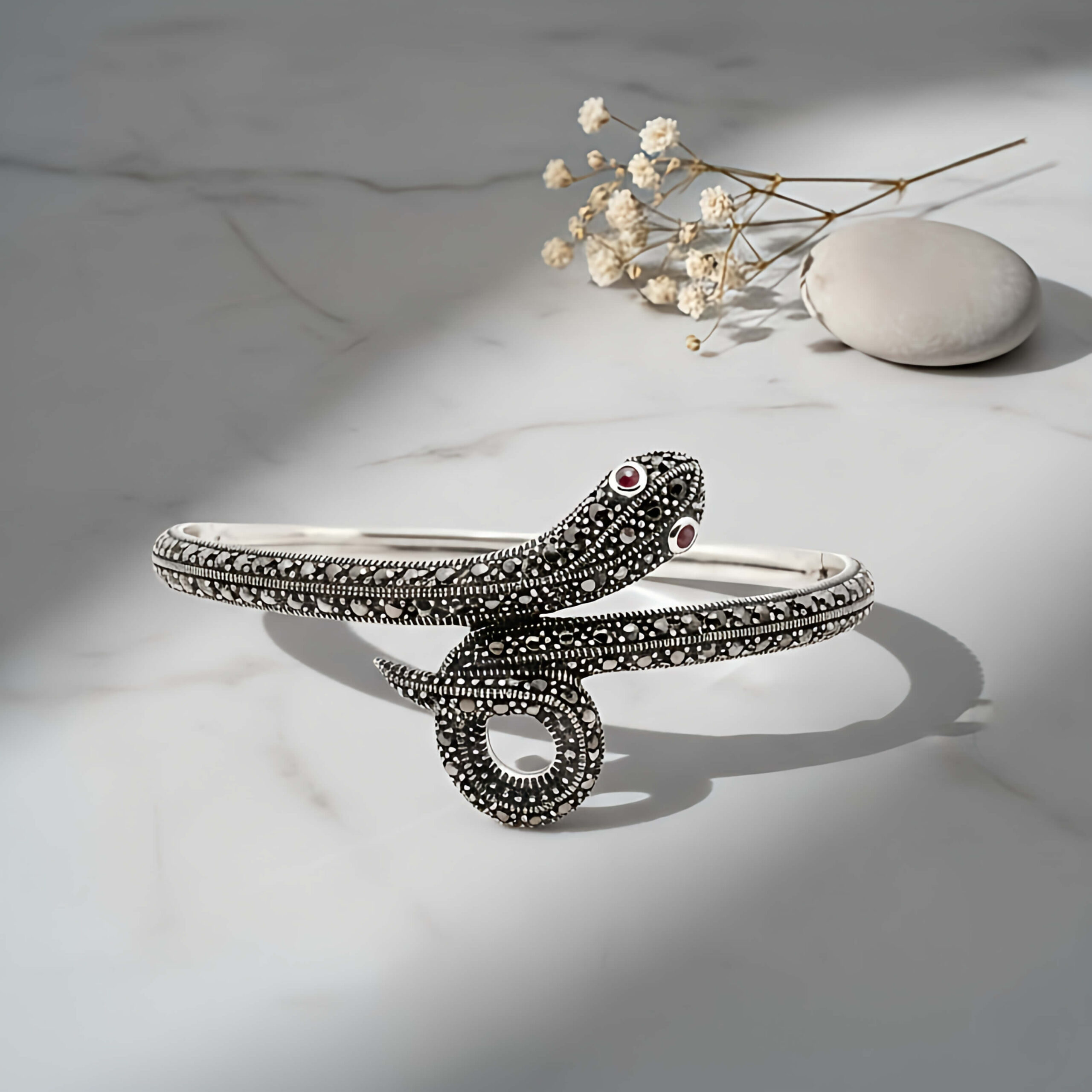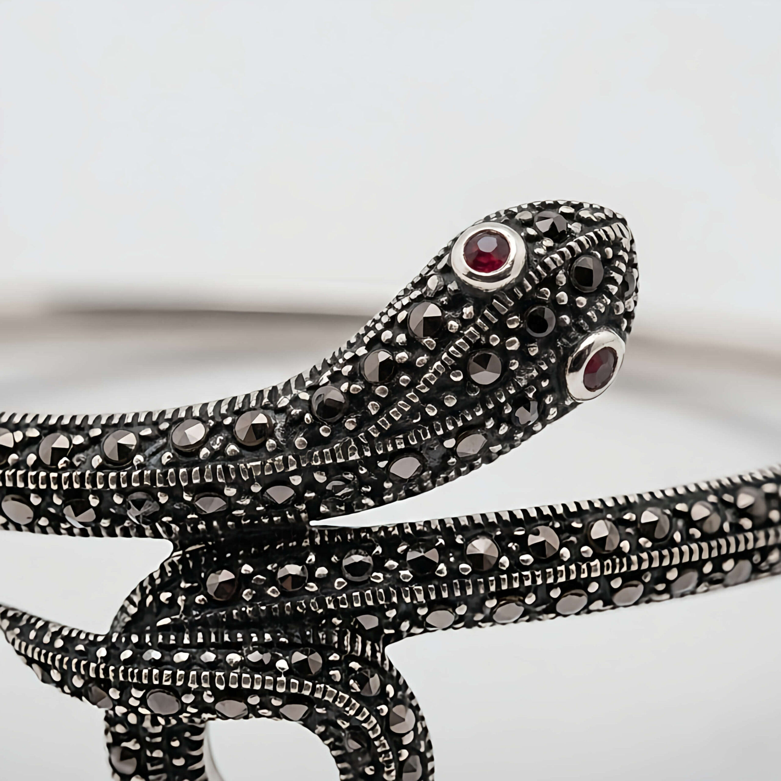 Trabalho Artesanal: O corpo da serpente é meticulosamente cravejado com pedras de marcassita, que garantem um brilho metálico vintage e sofisticado.