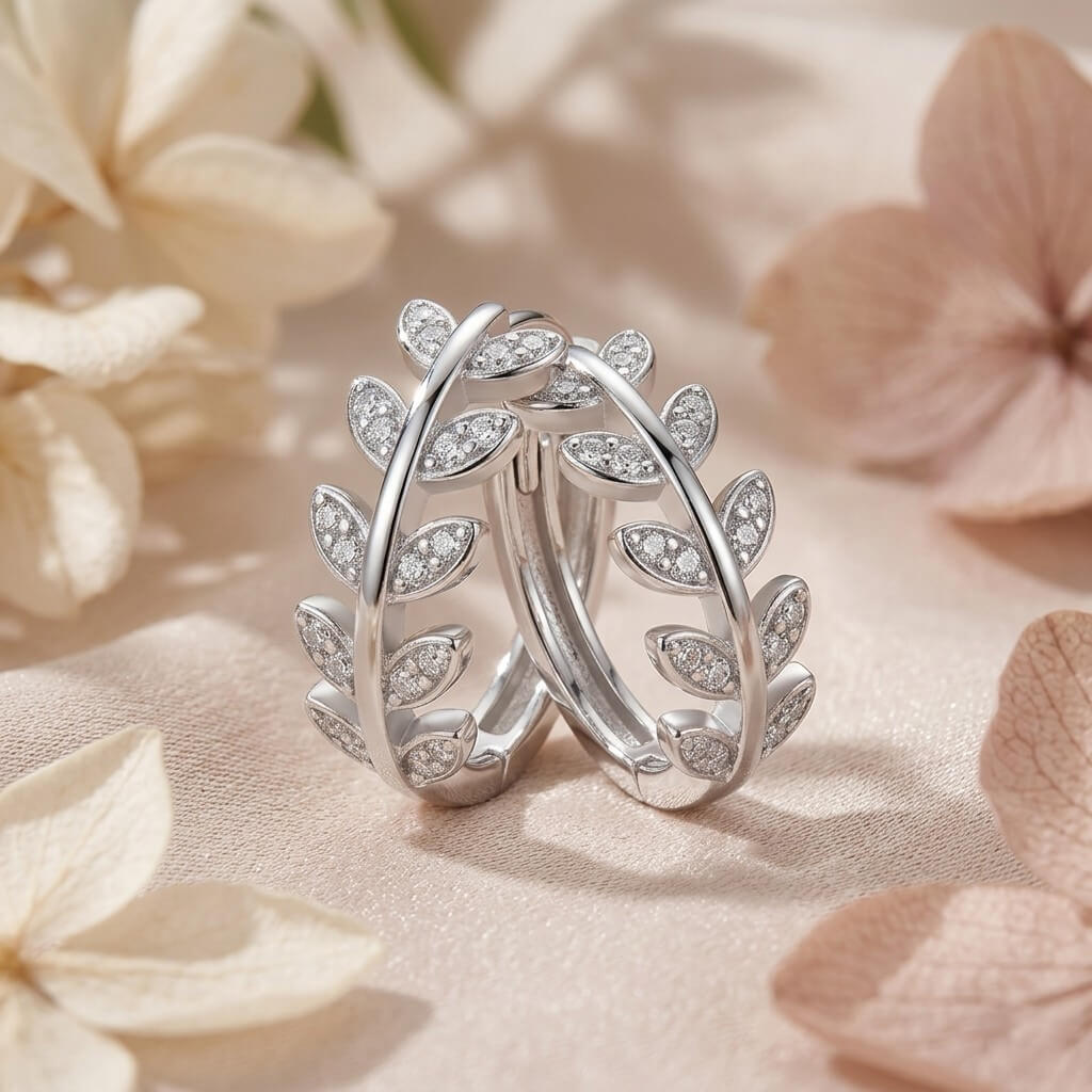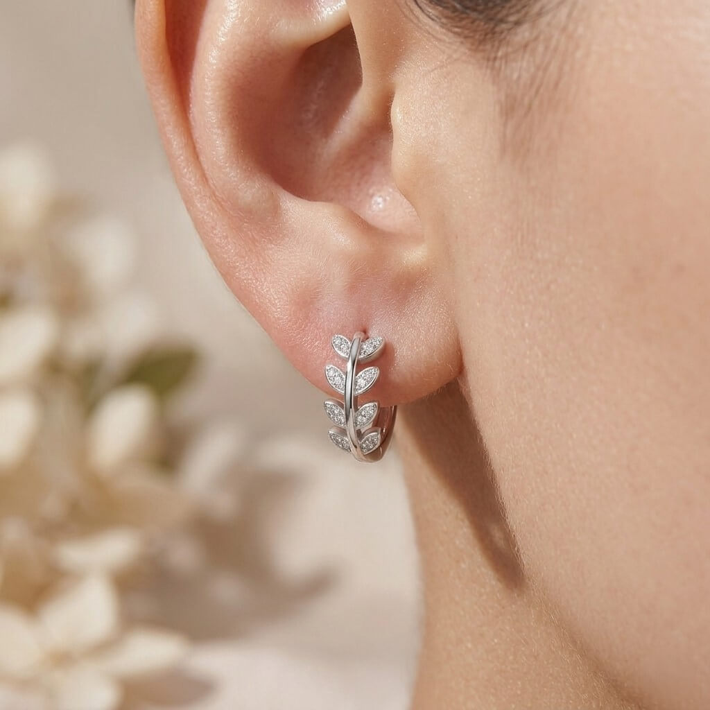 Confeccionada em Prata 925 legítima, esta argola apresenta um design de ramo de folhas meticulosamente esculpido. Cada folha é individualmente cravejada com microzircônias premium, selecionadas para garantir um reflexo de luz intenso e constante, simulando a pureza de diamantes.