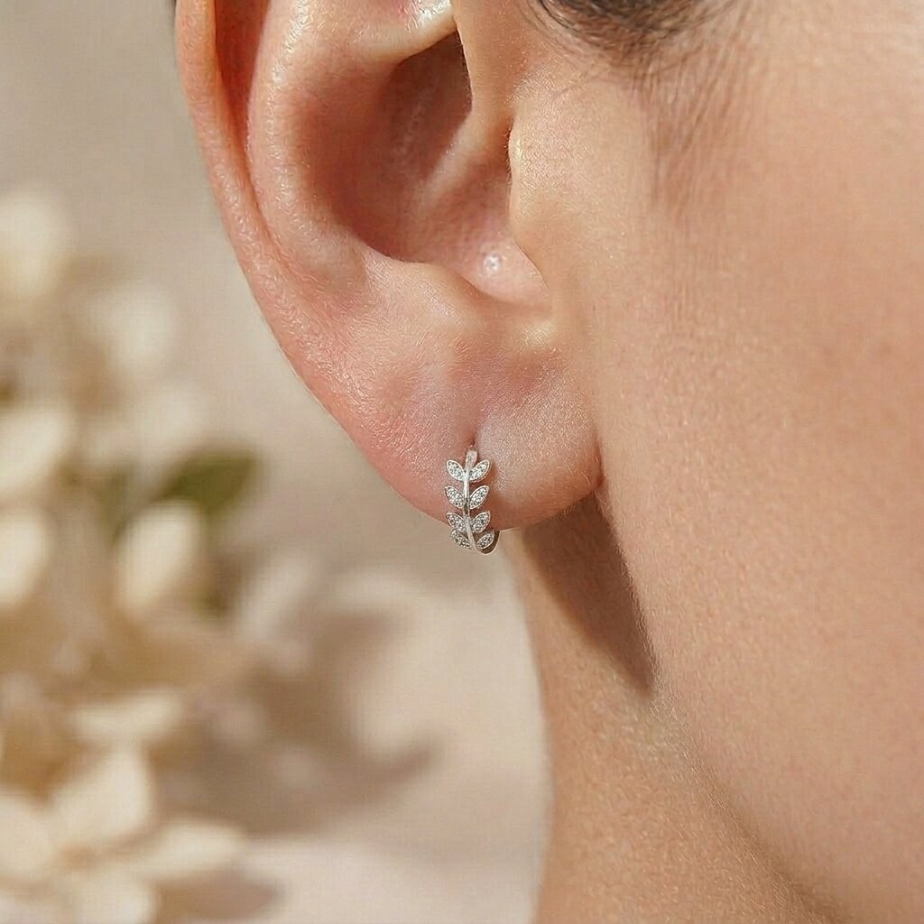 Brincos Argola de Prata Design Folha Cravejada Pequeno, estes delicados brincos da Pedranel unem a sofisticação da Prata 925 com o frescor do design botânico. Em formato de pequenas argolas, cada peça apresenta um padrão detalhado de folhas que abraçam a orelha com sutileza.