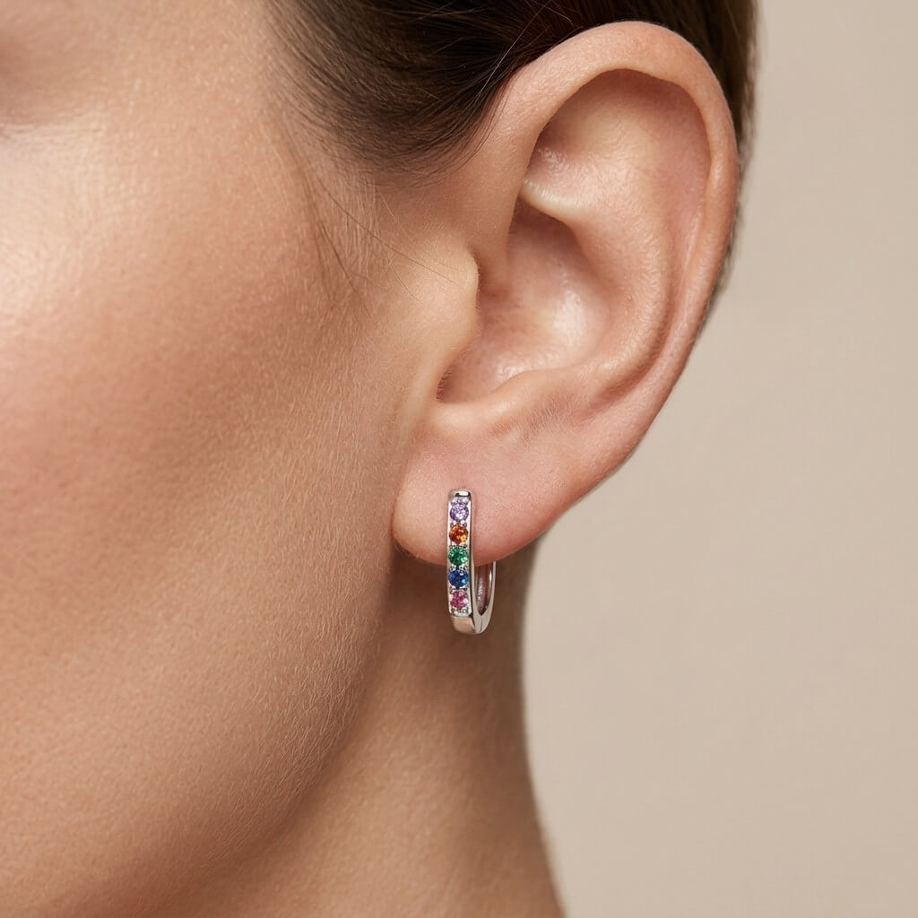 O grande destaque fica para a cravação vertical de cinco zircônias selecionadas, criando um degradê multicolorido que remete à beleza do arco-íris. É a escolha perfeita para quem busca um ponto de luz criativo sem abrir mão da elegância clássica do acabamento em ródio.