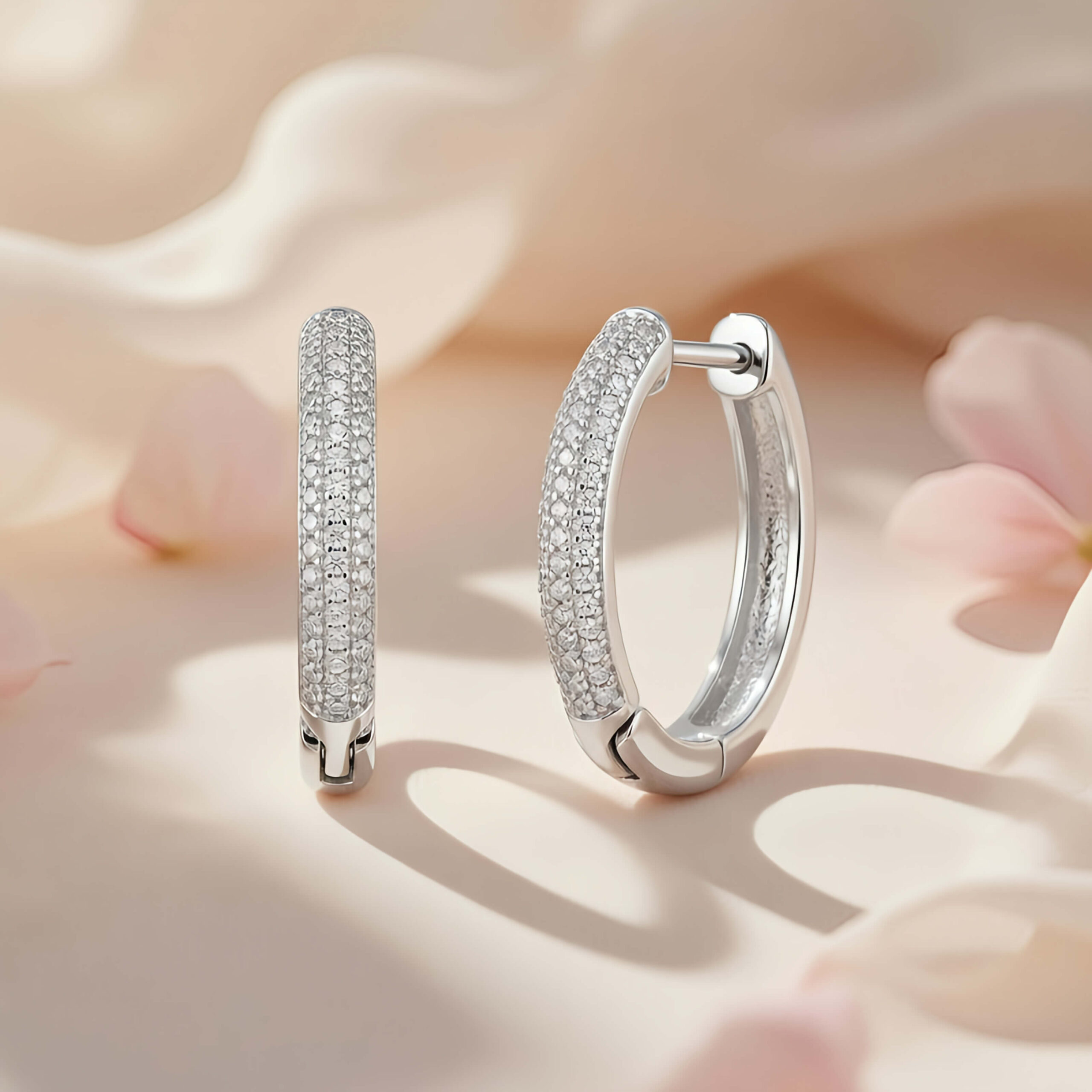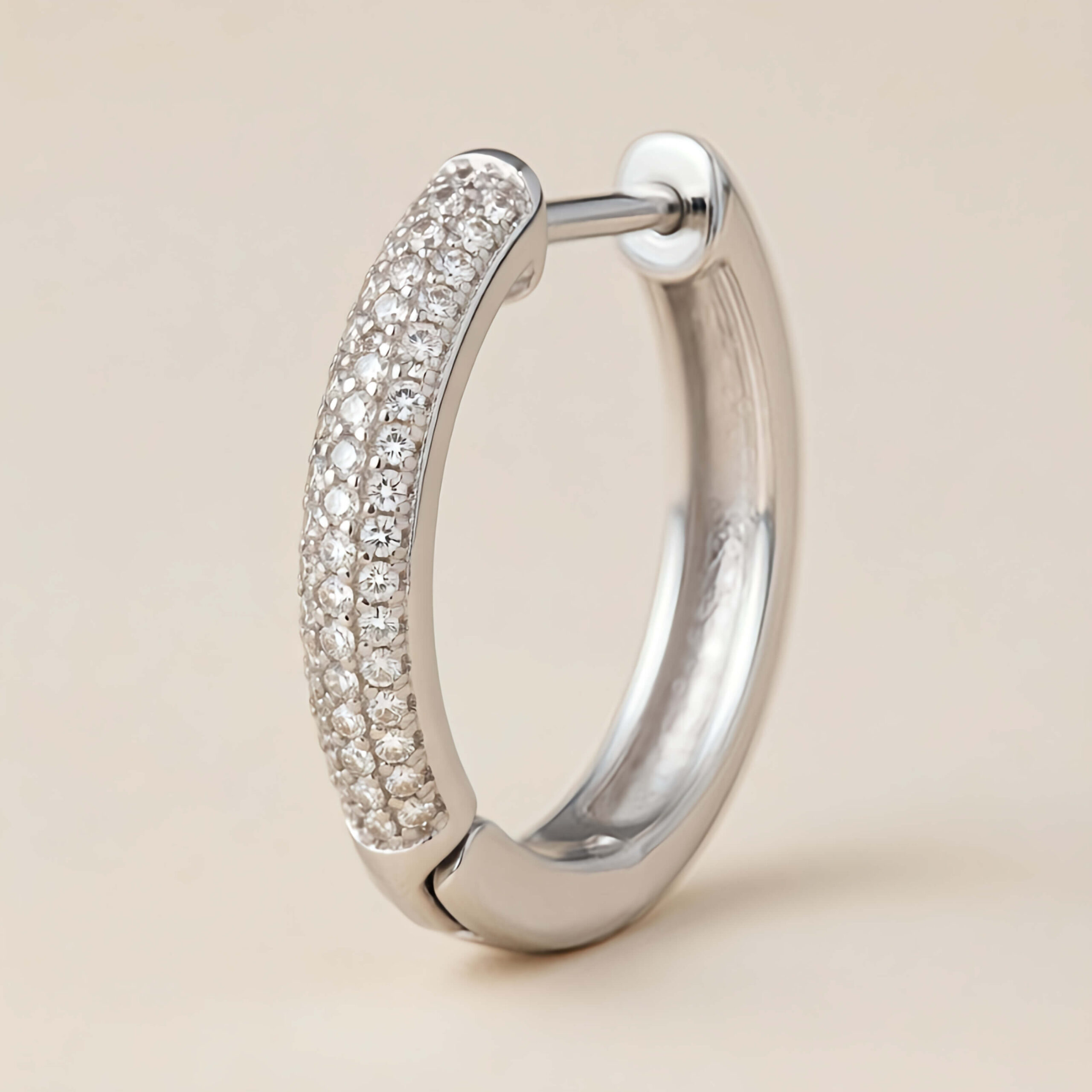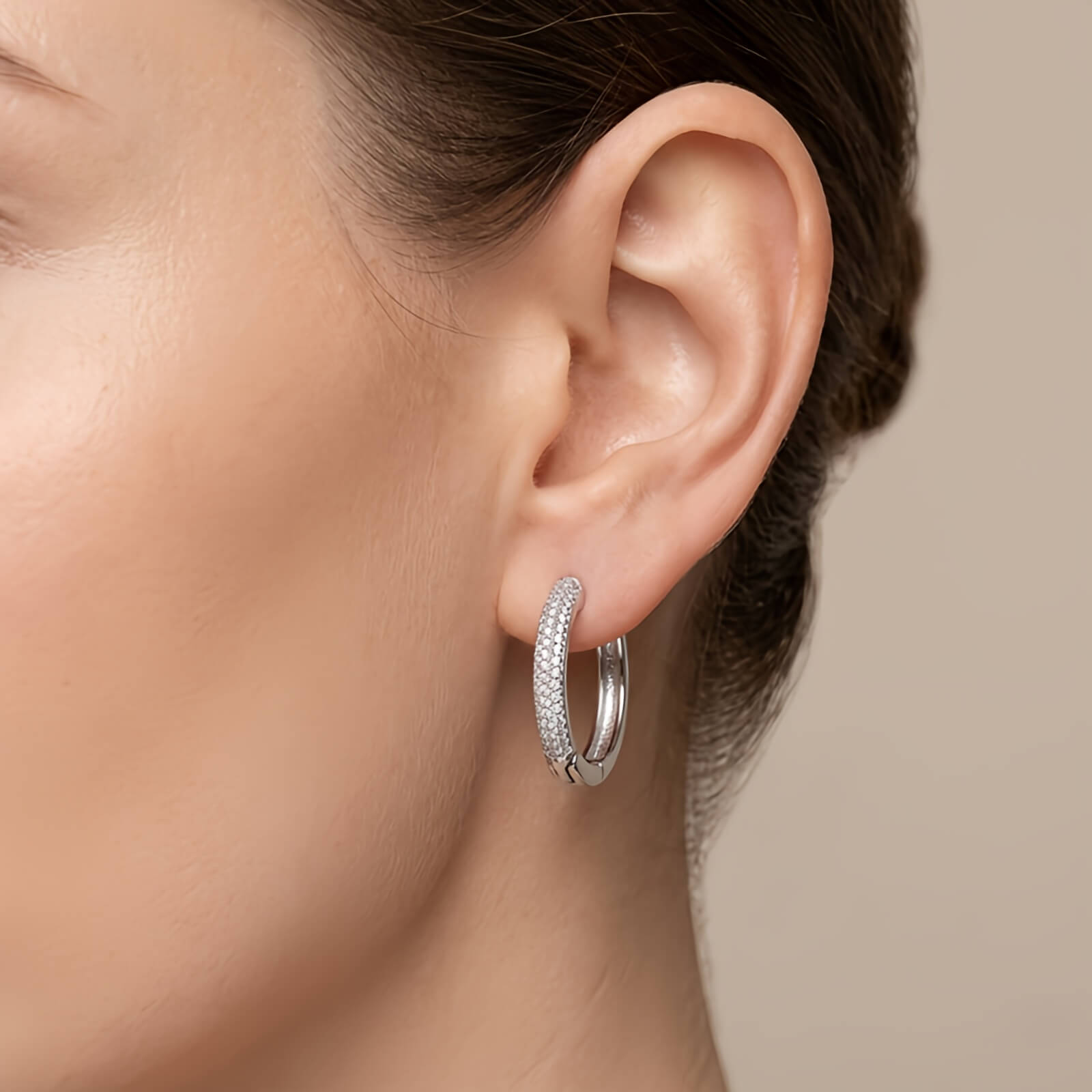 Brincos Argola Riviera confeccionadas em Prata 925 legítima, estas argolas apresentam uma cravação impecável no estilo pavé, onde zircônias de brilho extra selecionadas são posicionadas lado a lado para criar um reflexo de luz contínuo e hipnotizante.