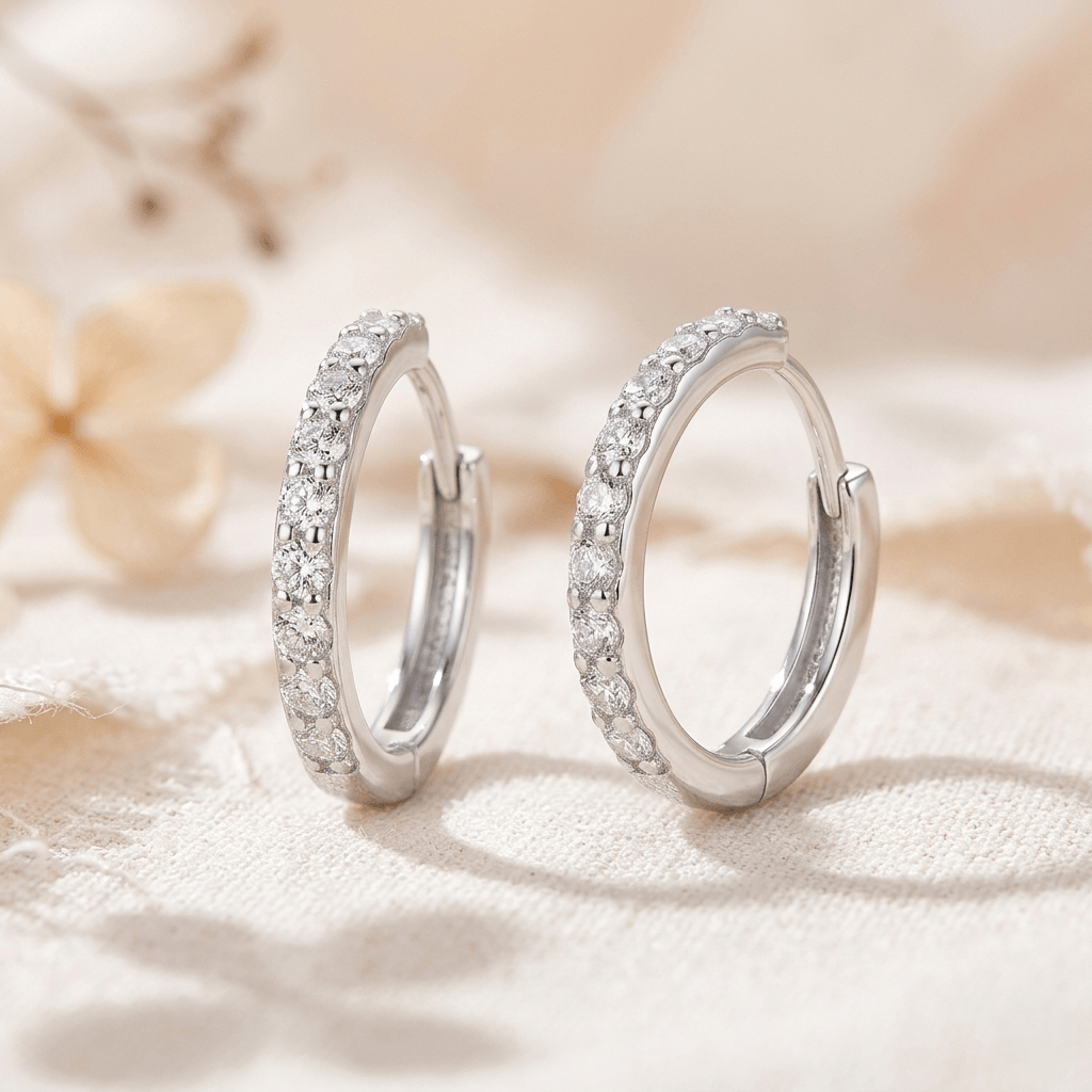 Brincos Argolas Huggie Cravejadas, com um design minimalista que “abraça” a orelha (estilo huggie), estas peças são ideais tanto para o uso diário quanto para composições mais elaboradas em furos secundários.