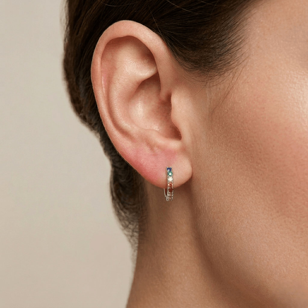 Adicione um toque de cor e brilho real ao seu visual com os Brincos Argolas Royal Crystal Pavé. Esta peça exclusiva da Pedranel combina a elegância atemporal das argolas com a vivacidade de um arco-íris de cristais selecionados.