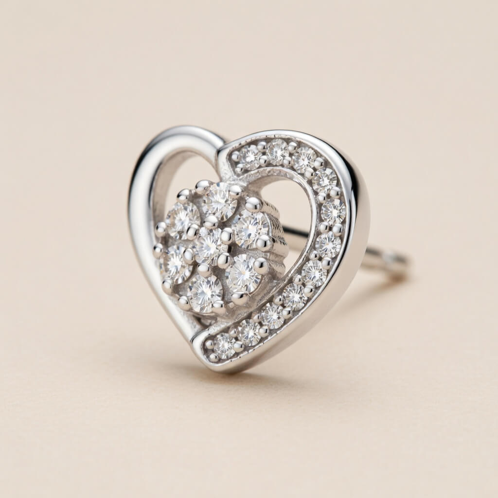 Design: Coração assimétrico com detalhes cravejados na curvatura e centro iluminado.