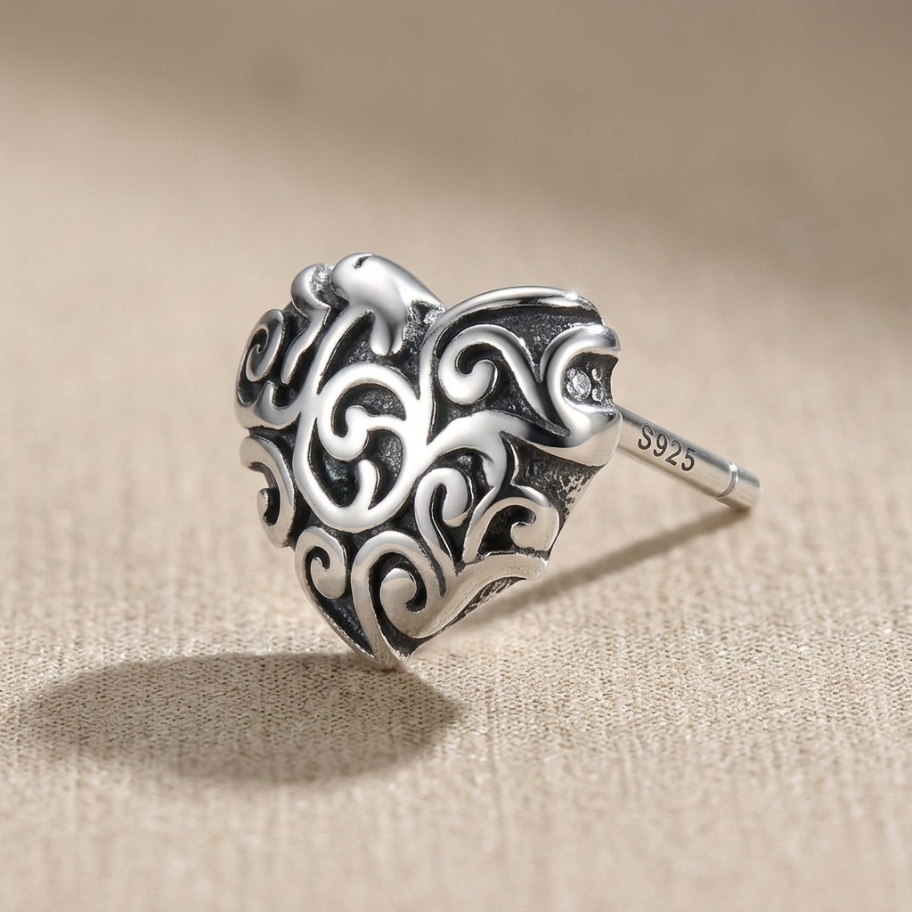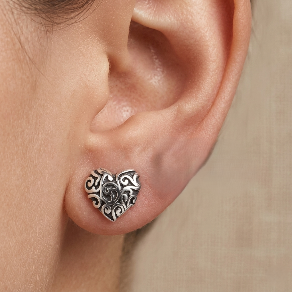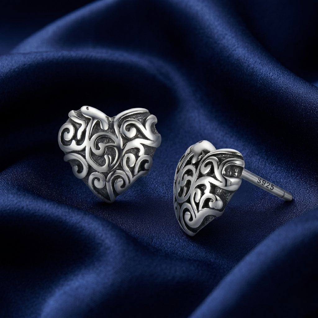 Brincos Coração Textura Envelhecida, estes brincos em Prata 925 legítima trazem um design de coração nada óbvio. Com detalhes em arabescos vazados e um acabamento oxidado (envelhecido), eles criam um contraste fascinante entre o brilho da prata e as sombras do relevo, conferindo uma profundidade vintage irresistível.