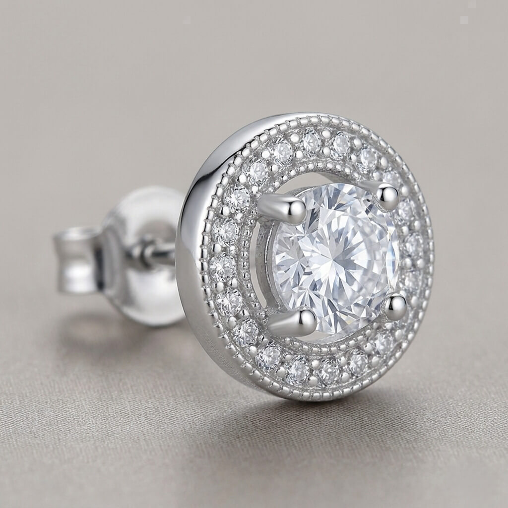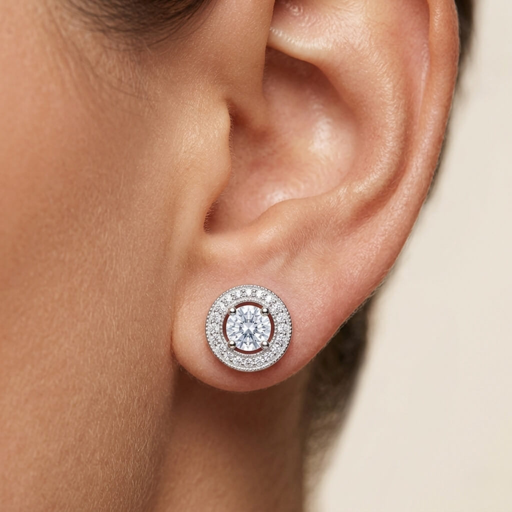 Design Halo Radiante: Uma imponente pedra central circular é abraçada por um halo de microzircônias cravejadas, maximizando a reflexão da luz a cada movimento.