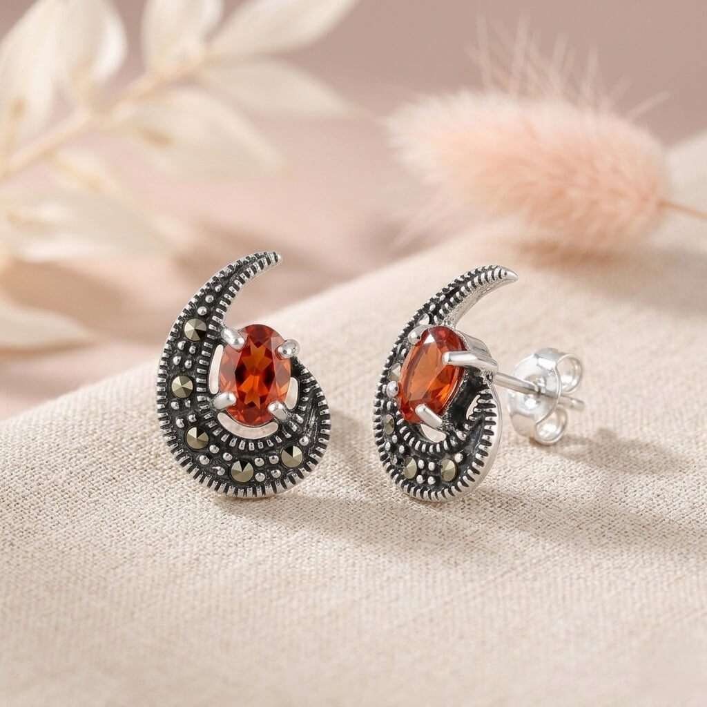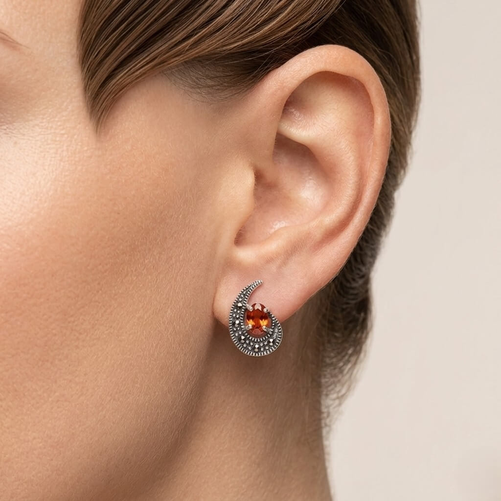 Resgate a elegância de outras eras com estes brincos exclusivos da Pedranel. Confeccionados em Prata 925 legítima, esta peça une o brilho misterioso das marcassitas ao destaque de uma gema central lapidada, criando um contraste sofisticado e atemporal.