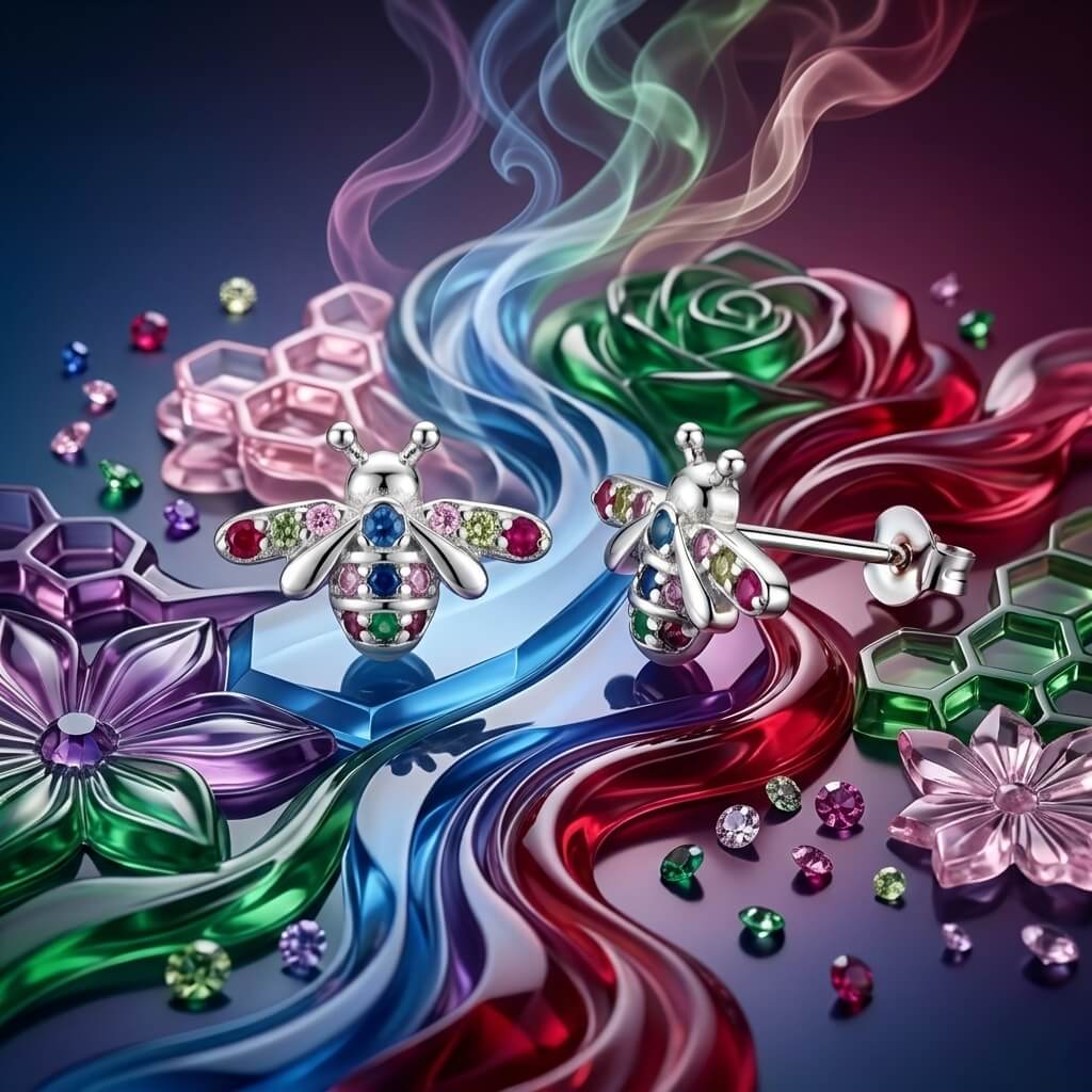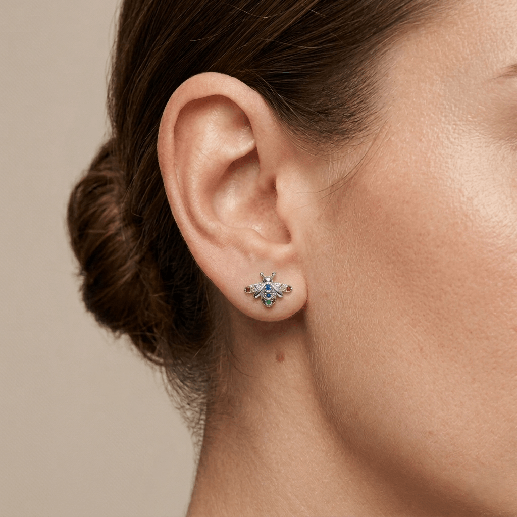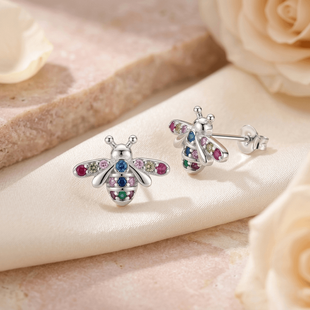 Brincos Jardim de Pedrarias. Confeccionados em Prata 925 de alta qualidade, estes brincos em formato de abelha trazem um trabalho minucioso de cravação que transforma cada peça em uma verdadeira joia de jardim.