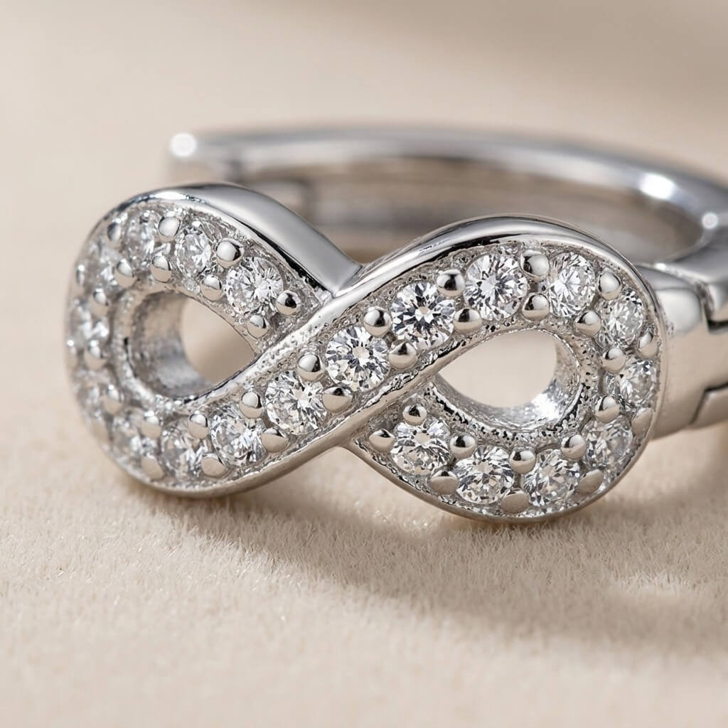 O destaque fica para o ícone do infinito, meticulosamente cravejado com zircônias de alto brilho, que capturam a luz de forma sutil e sofisticada. É a joia ideal para quem acredita que o luxo está nos detalhes e que o brilho deve ser uma extensão da sua personalidade.
