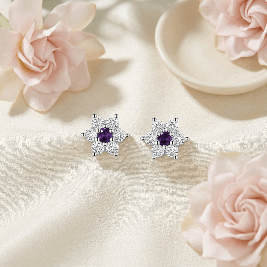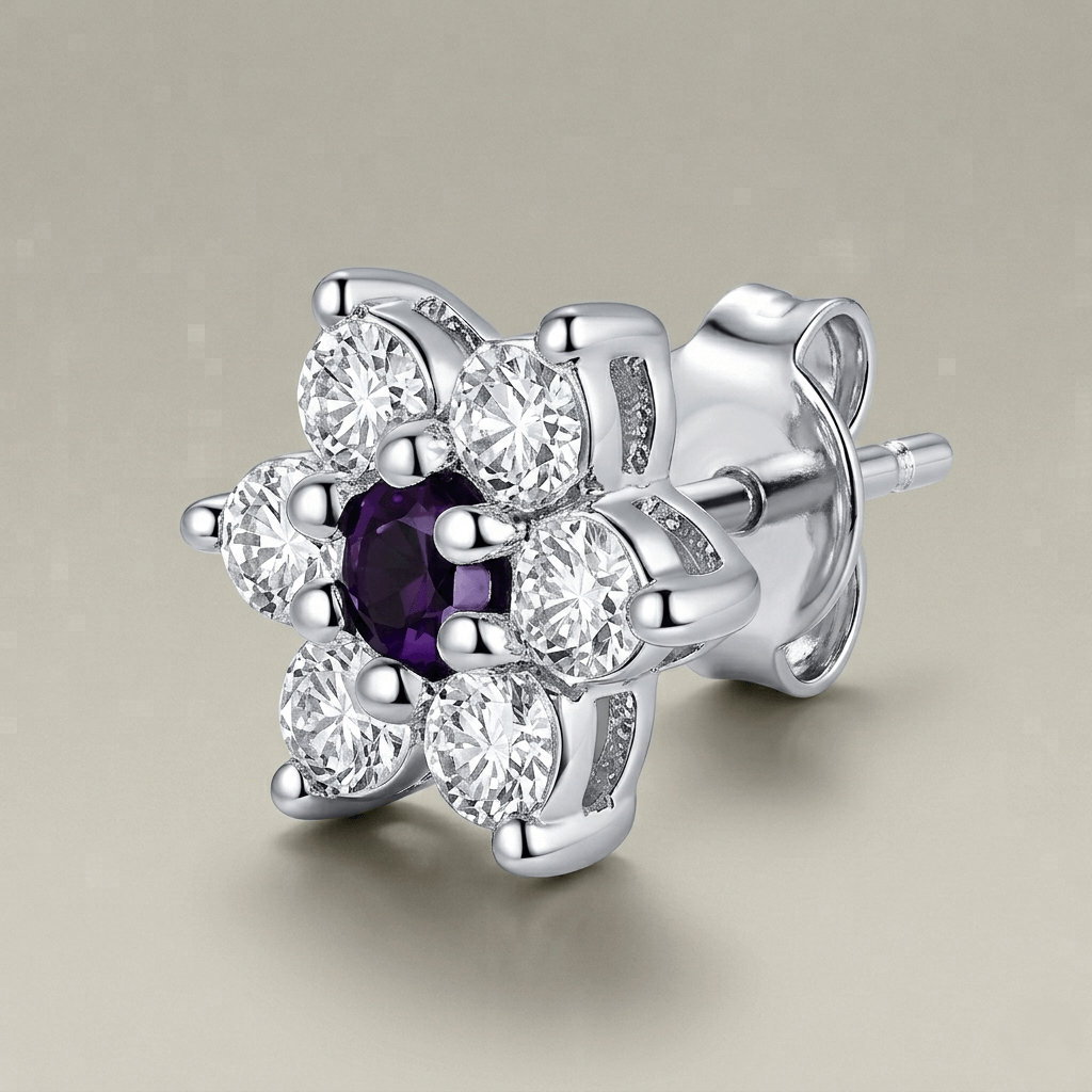Com o formato de uma pequena flor em desabroche, cada peça apresenta um centro em tom ametista envolto por pétalas de zircônias translúcidas, criando um contraste vibrante e iluminado.