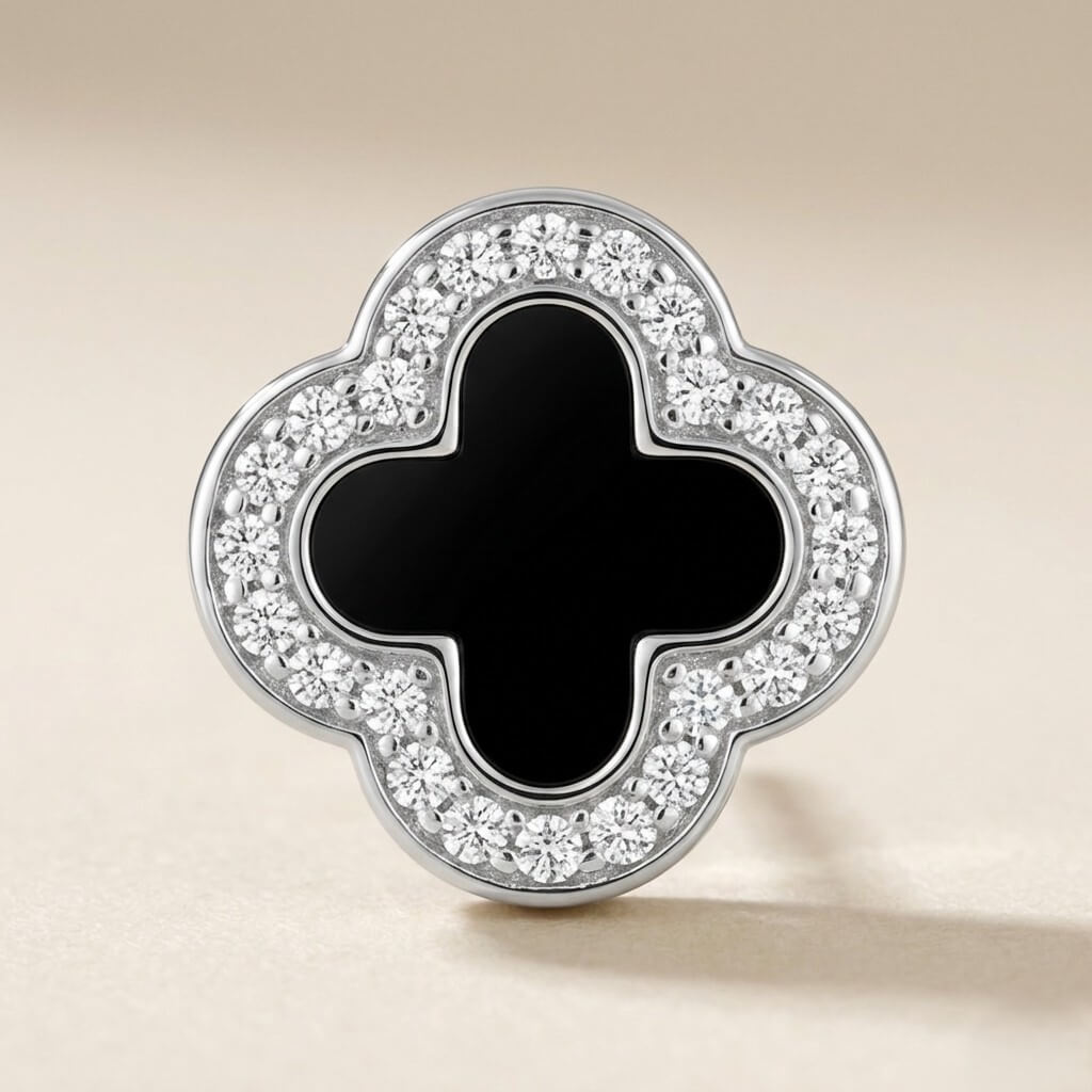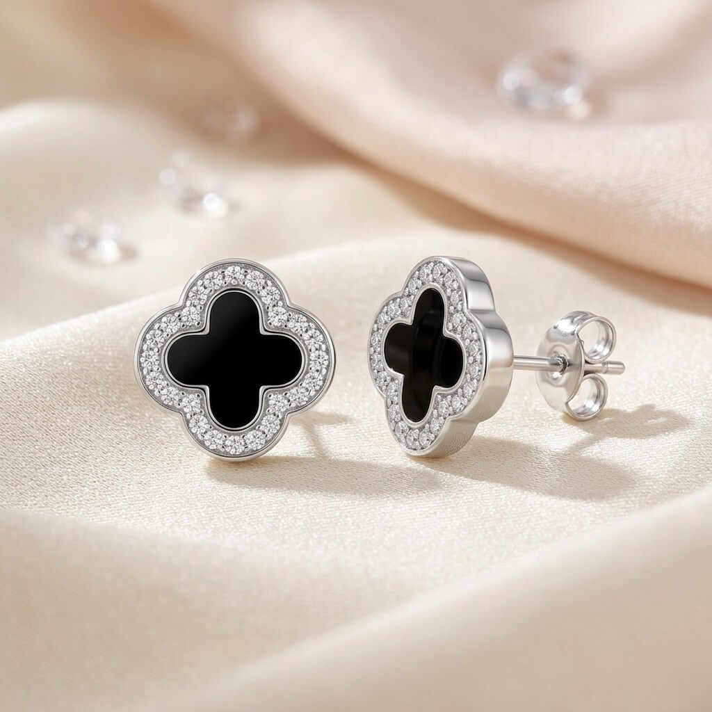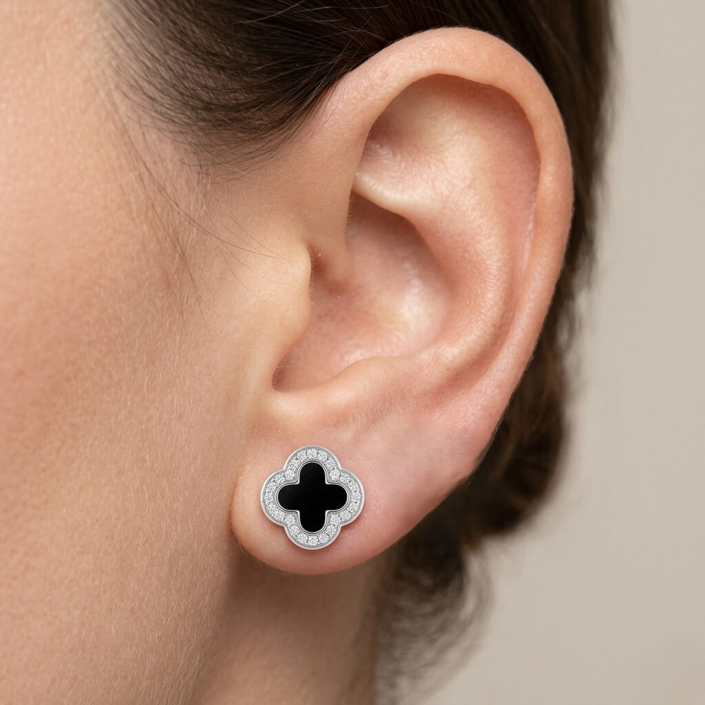 Este par une o simbolismo milenar do trevo de quatro folhas com o contraste luxuoso entre o negro profundo do centro e o brilho intenso da moldura cravejada.