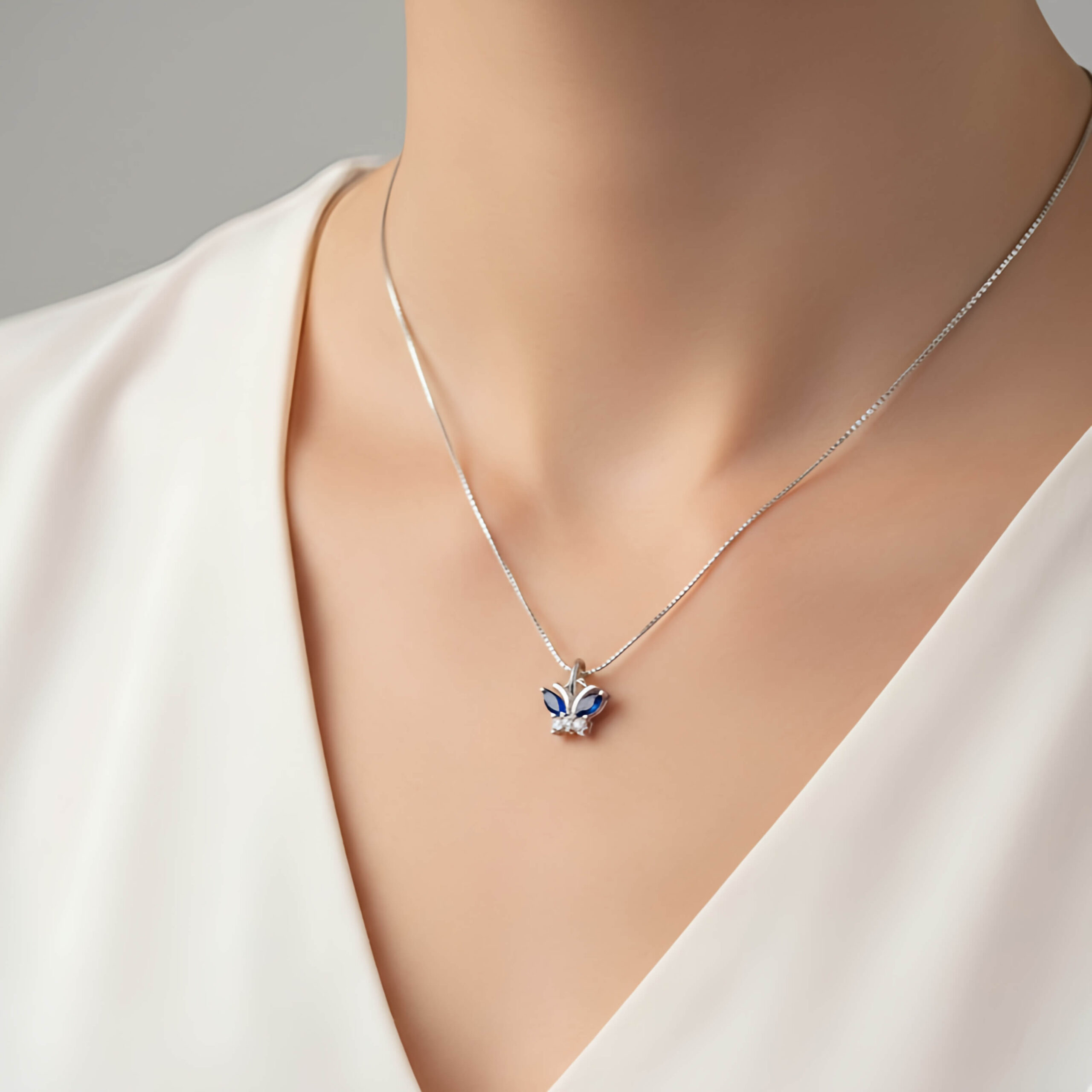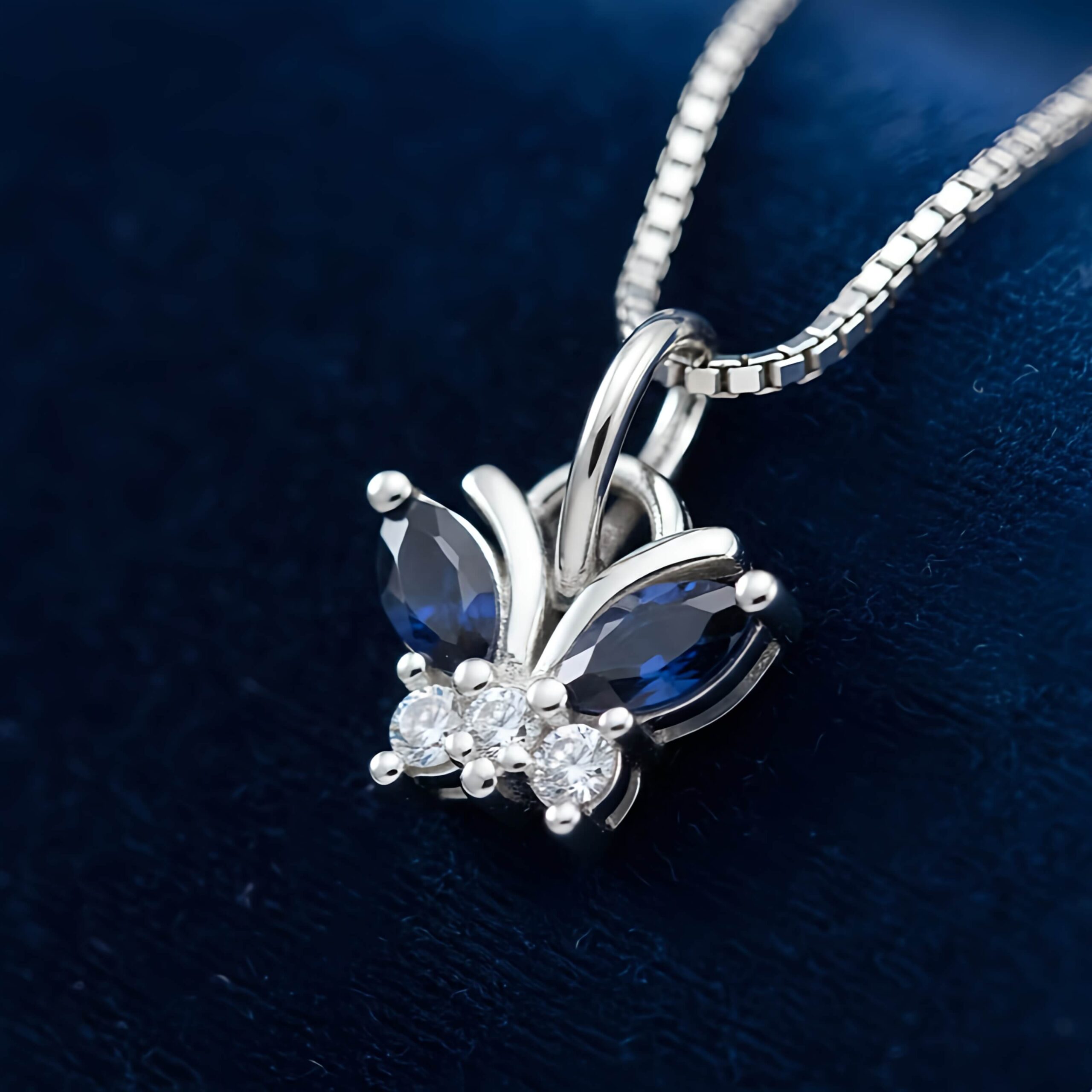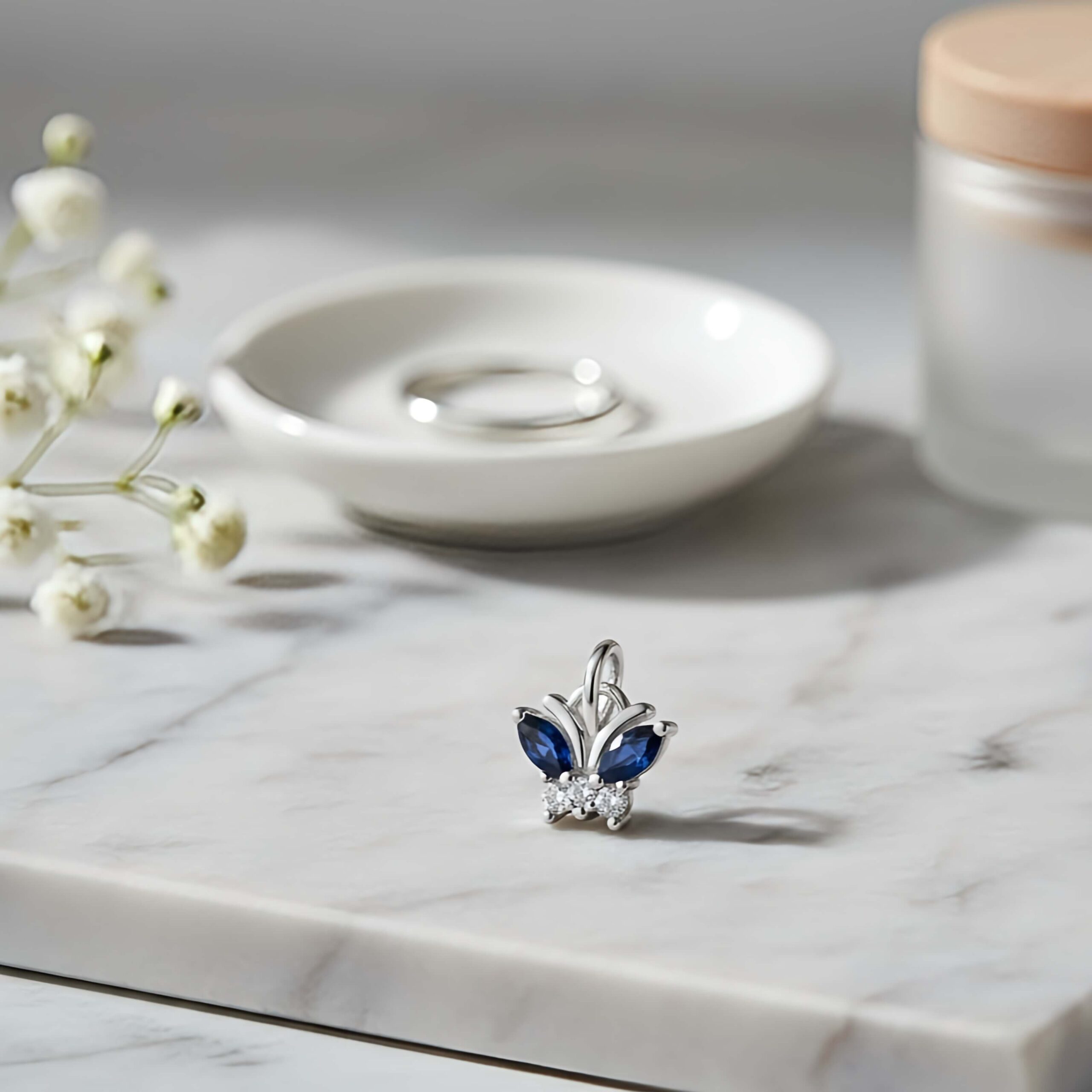 • Asas de Safira: As asas superiores são compostas por duas zircônias azuis em lapidação marquise, que evocam a profundidade e o mistério da safira.