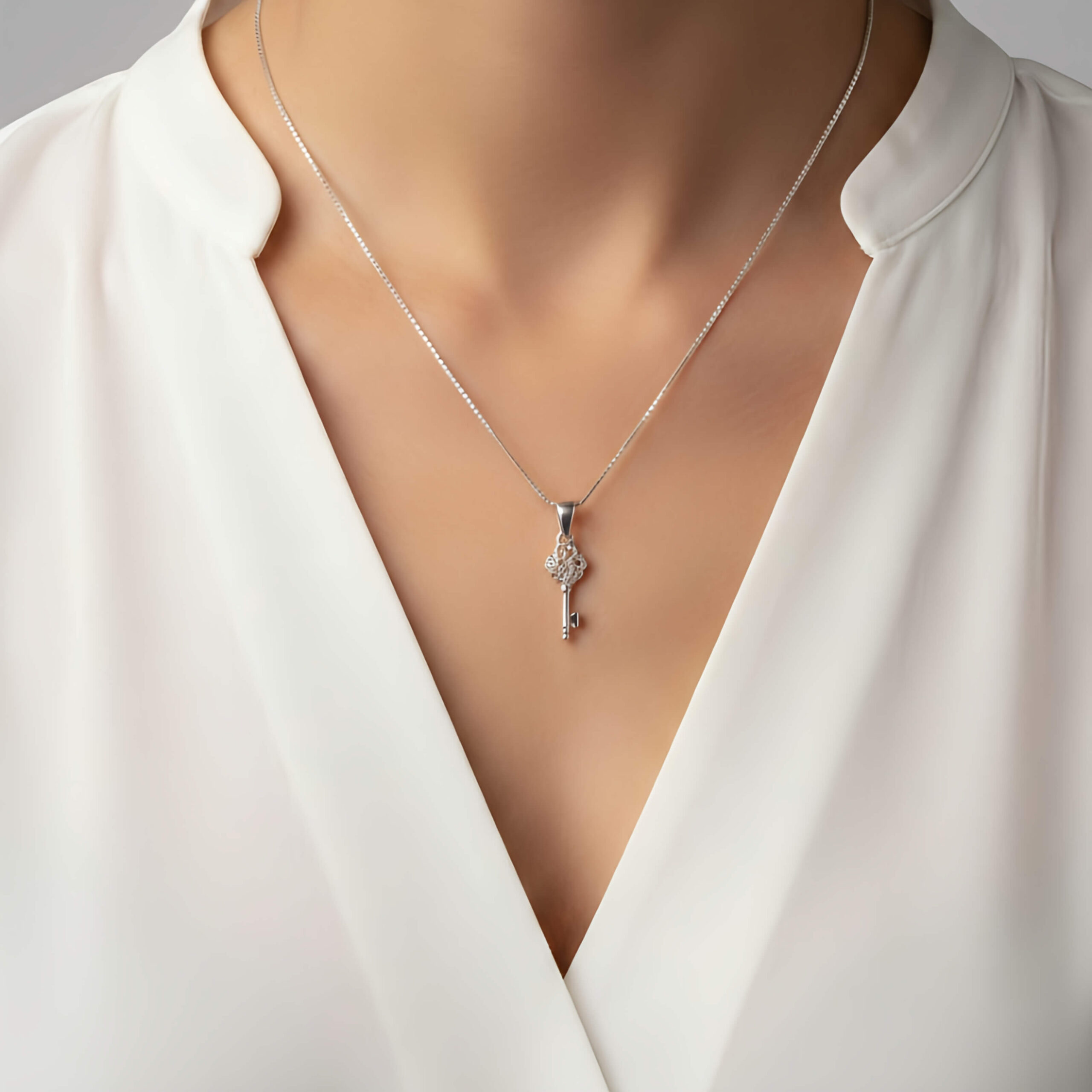 Pingente Chave do Coração é uma joia que une o design clássico do estilo vintage com a delicadeza da joalheria moderna. Seu topo apresenta um intrincado trabalho em filigrana, formando desenhos que remetem a arabescos e corações entrelaçados, simbolizando segredos guardados e conexões preciosas.