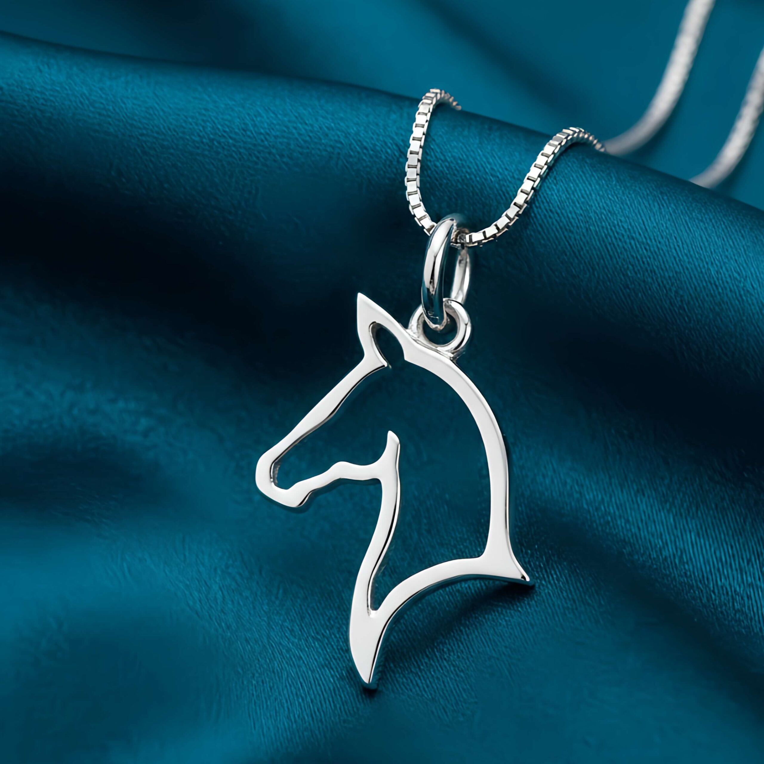 Pingente Espírito Livre. Com um design minimalista e contemporâneo, esta peça captura a essência da silhueta equina em traços fluidos e vazados, simbolizando a conexão indomável entre o ser humano e a natureza.