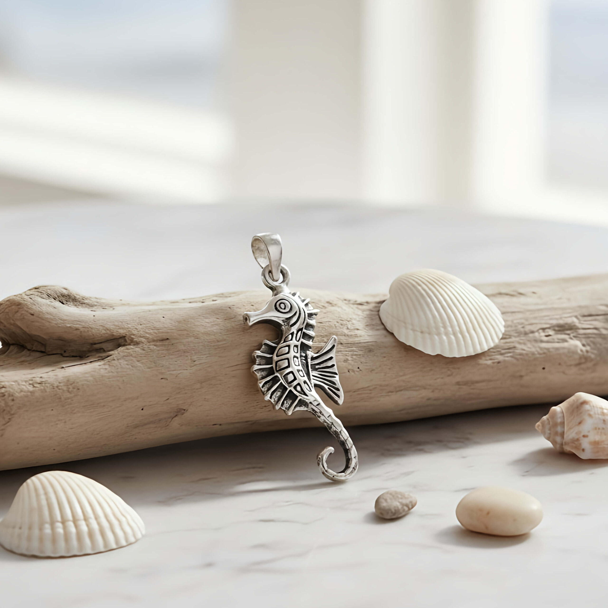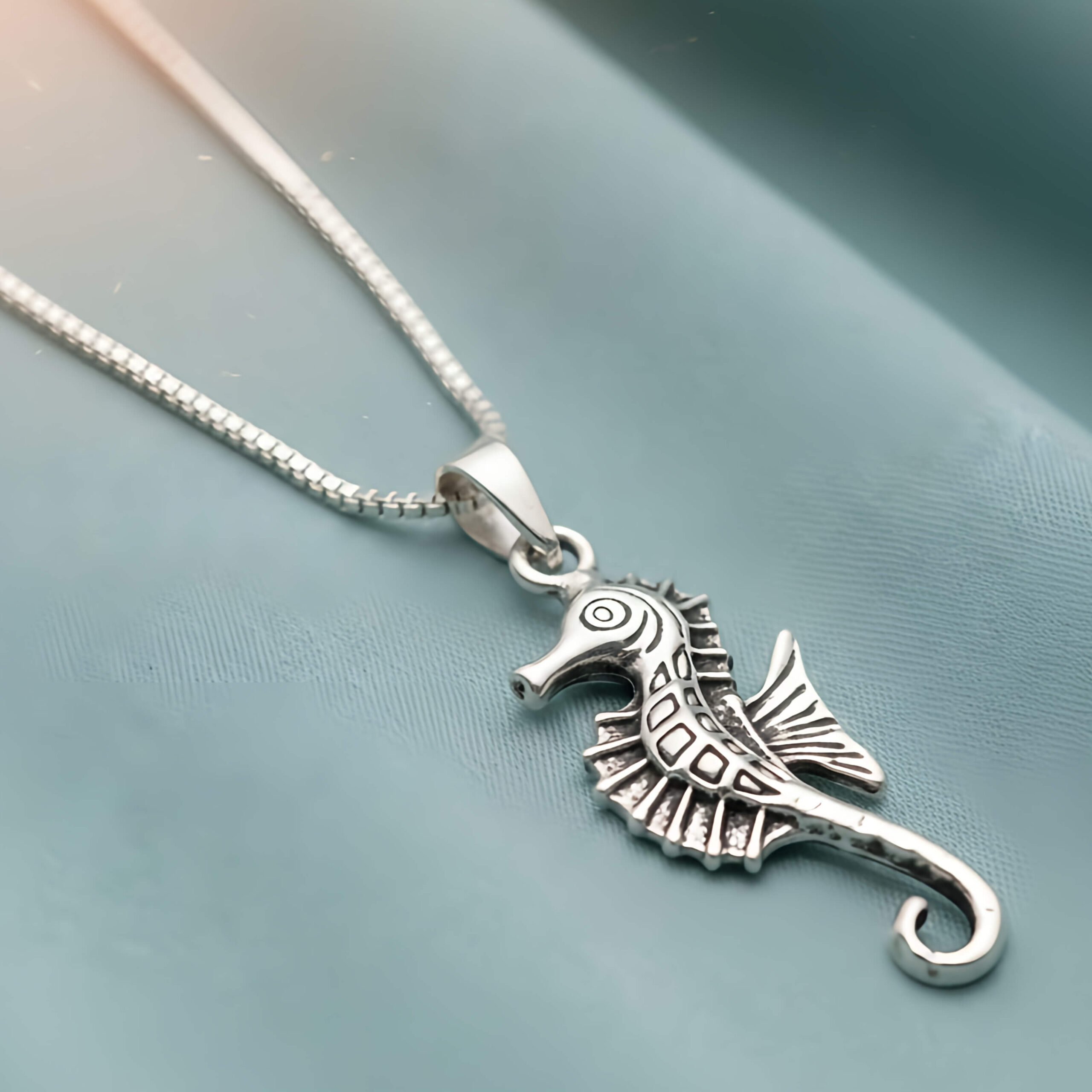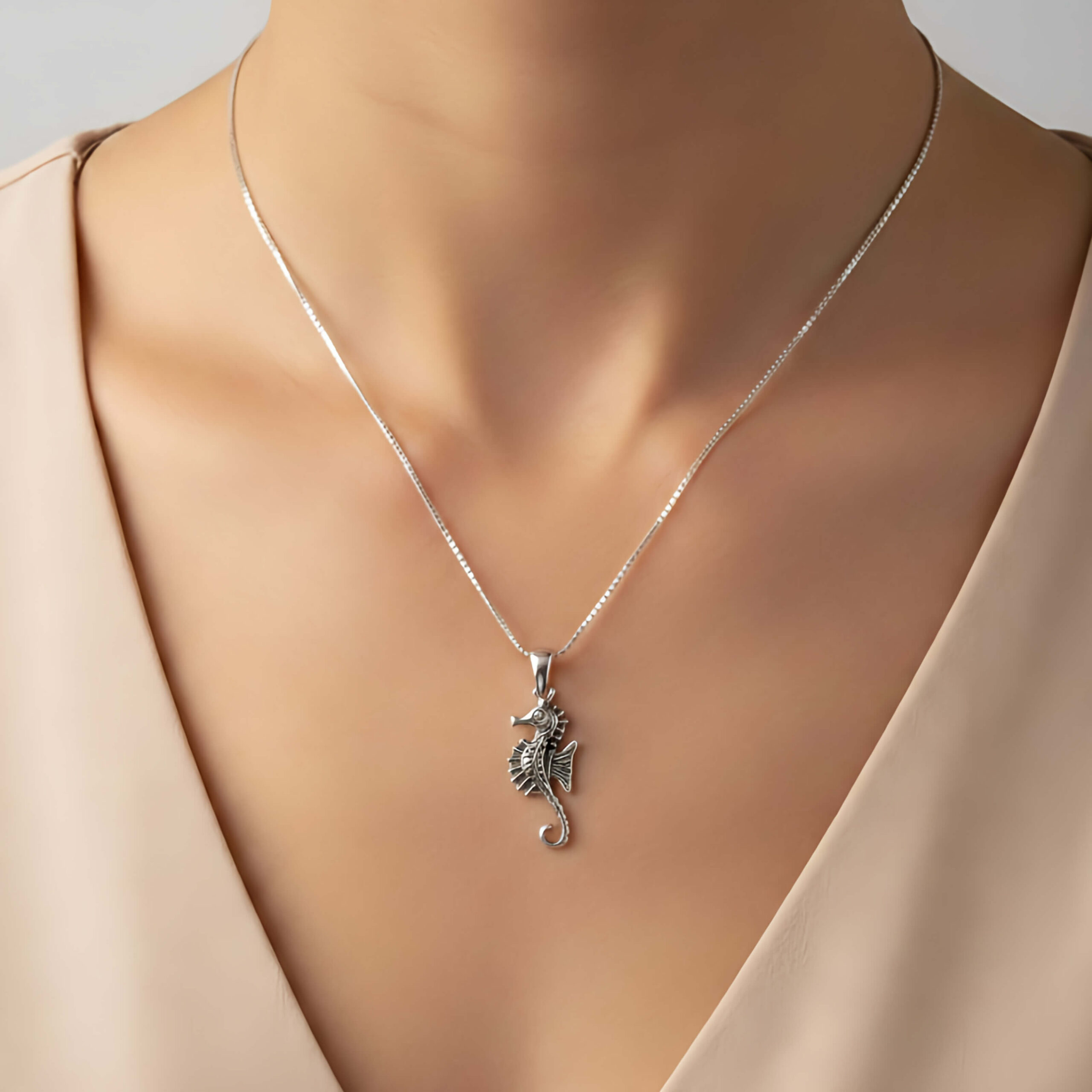 Pingente Seahorse. Confeccionado em Prata 925 de alta qualidade, esta joia apresenta um design rico em detalhes, com um acabamento levemente envelhecido que realça cada textura da anatomia única do cavalo-marinho.