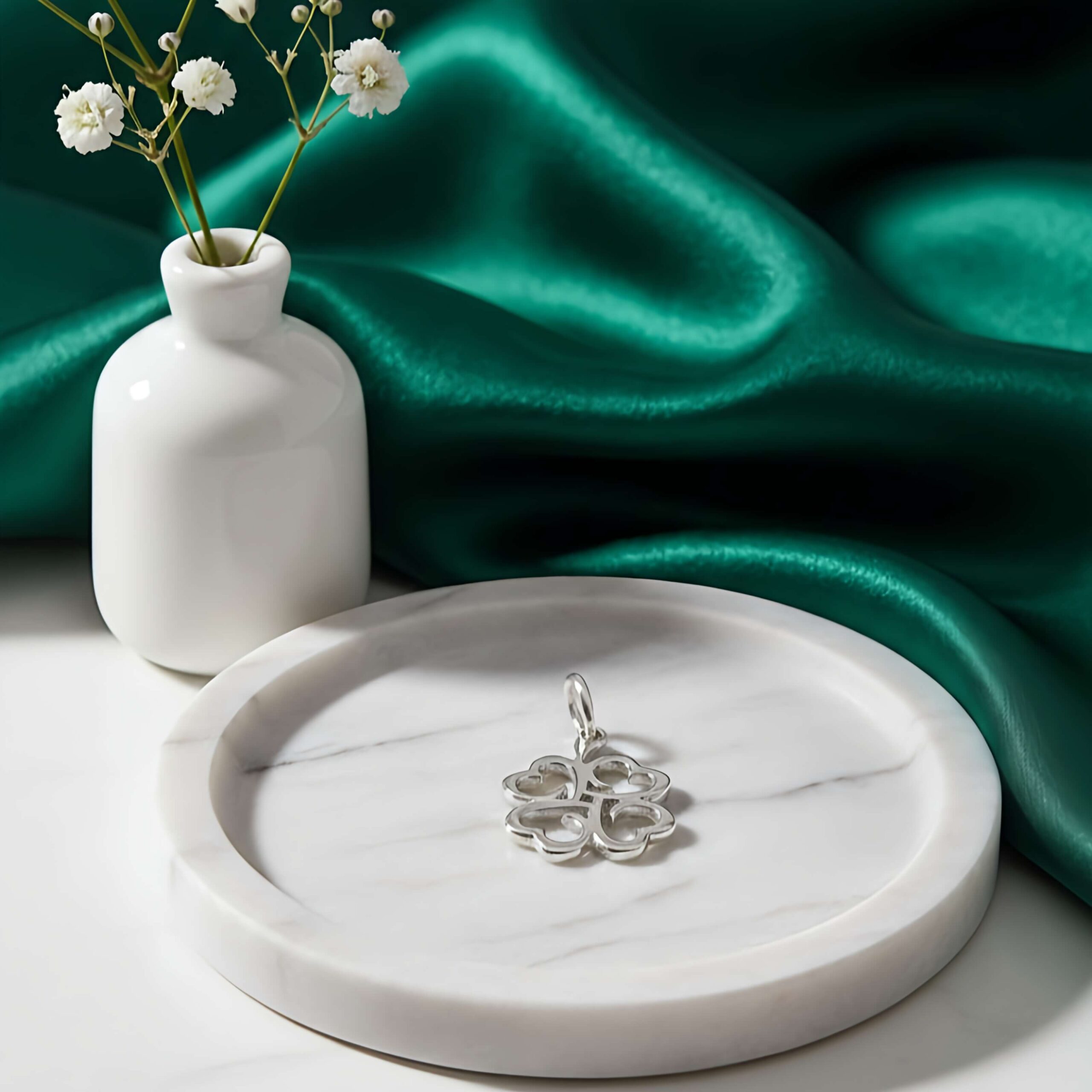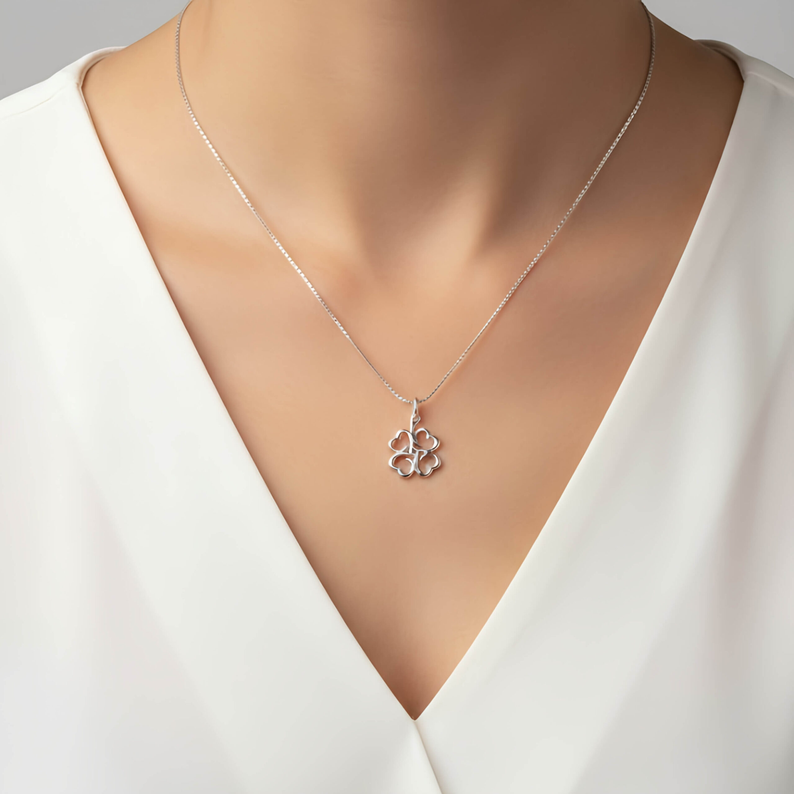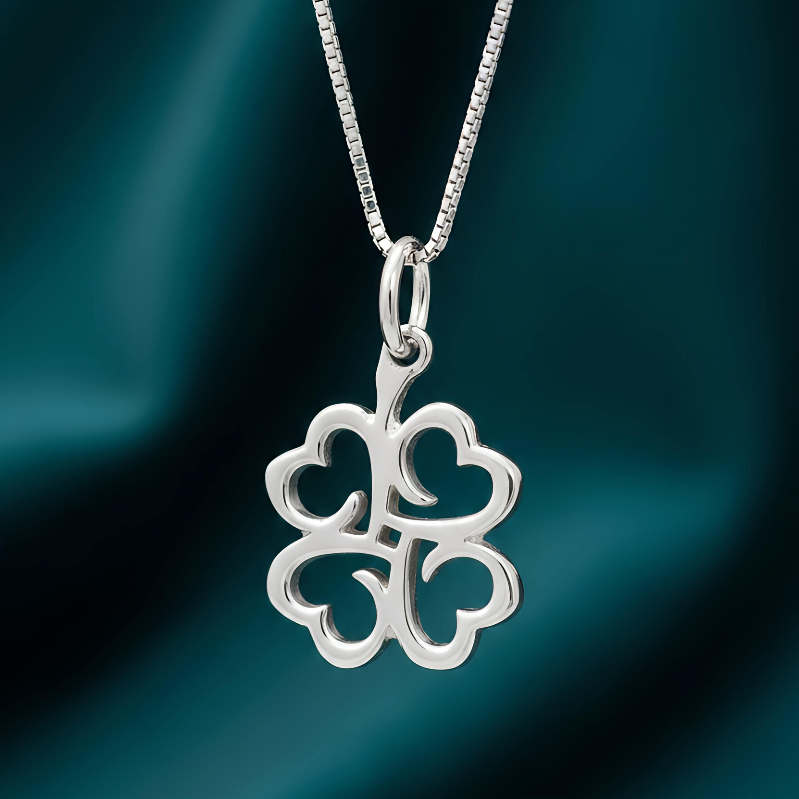 Pingente Trevo Quatro Folhas, Leve com você um símbolo eterno de proteção e boas energias. Este pingente exclusivo da Pedranel apresenta um design sofisticado de Trevo de Quatro Folhas, onde cada folha é delicadamente moldada em formato de coração vazado.