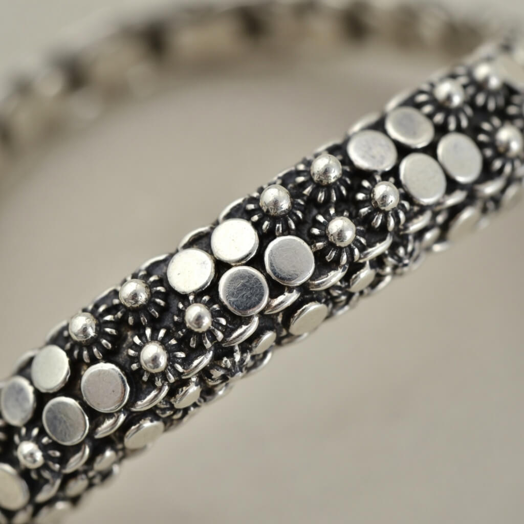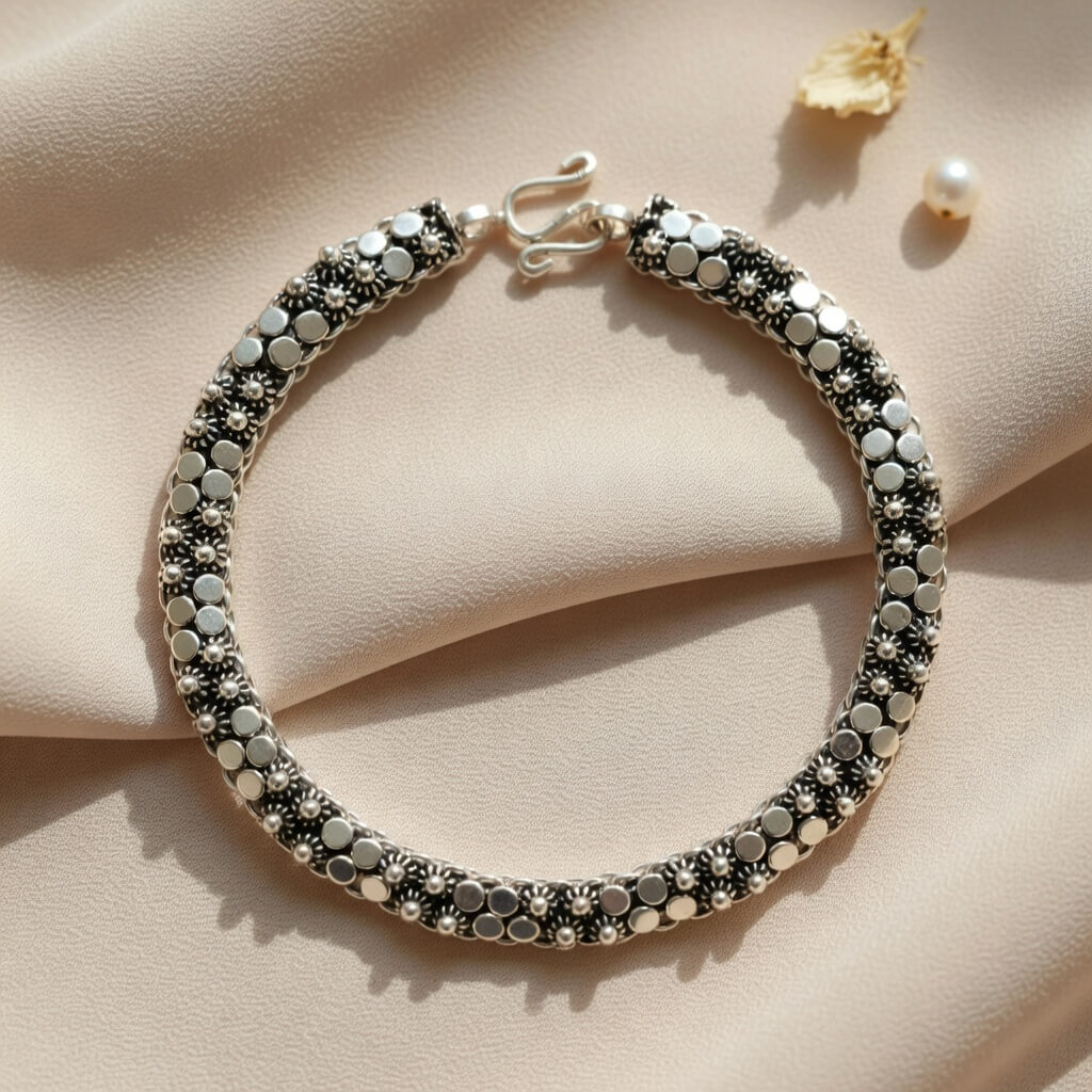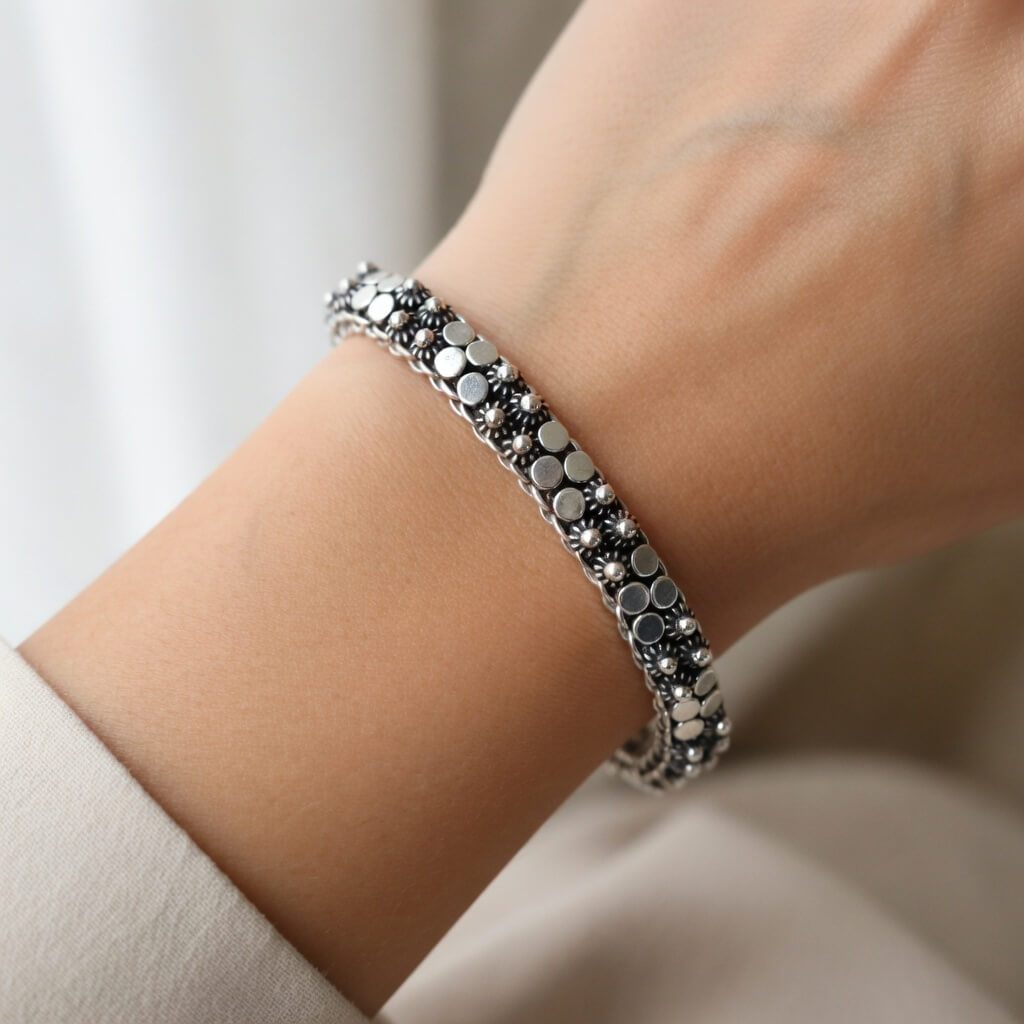 Pulseira Aura Design Orbital Envelhecida é uma celebração ao contraste e à geometria. Composta por uma sequência harmoniosa de discos polidos que parecem “orbitar” sobre uma base rica em detalhes, esta peça da Pedranel une o brilho espelhado da prata ao mistério do acabamento envelhecido (oxidado).