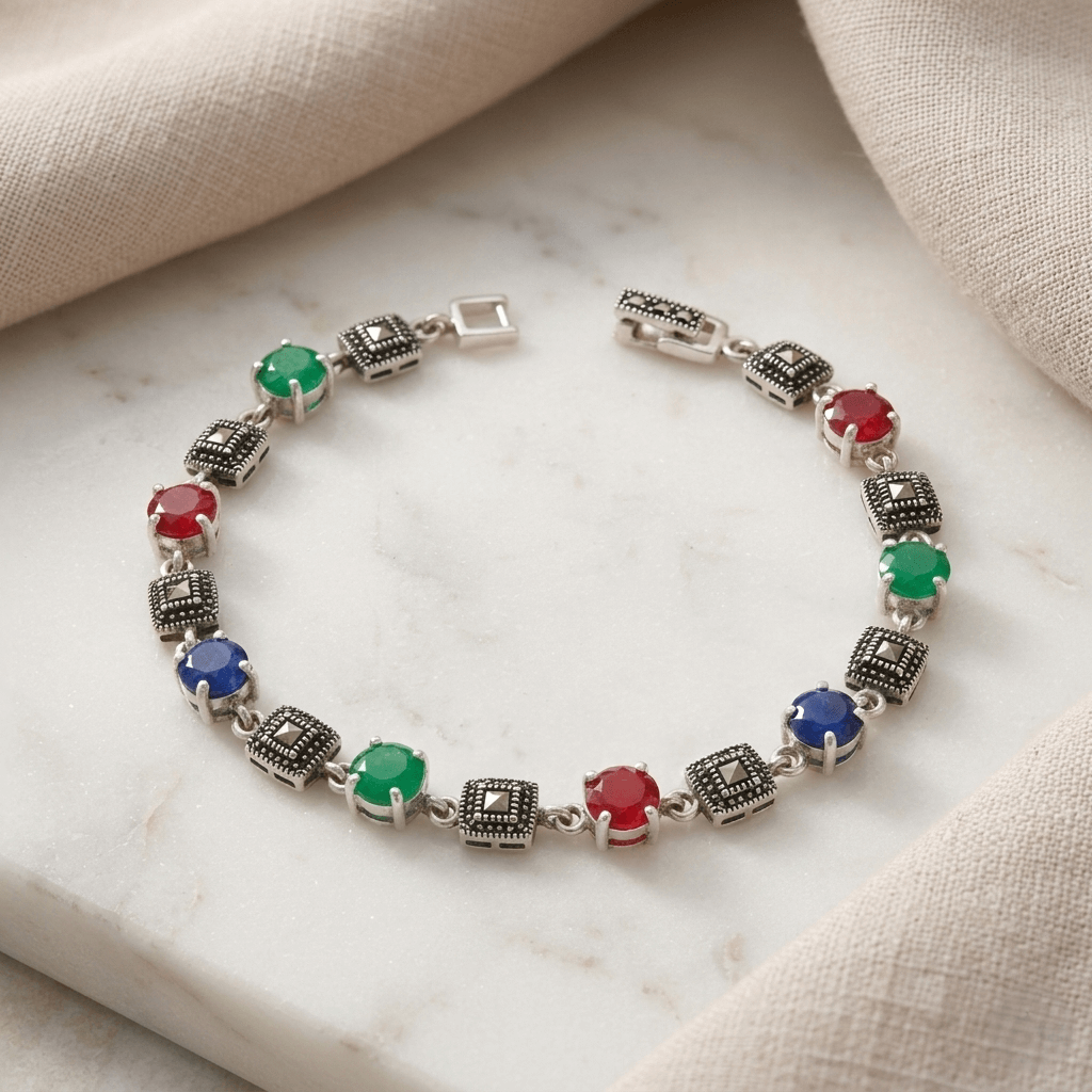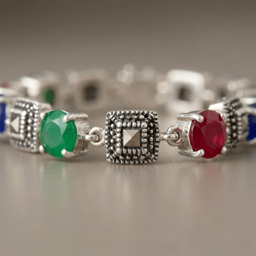 Pulseira Elegância Absoluta, confeccionada em Prata 925 de alta qualidade, esta joia apresenta um trabalho minucioso de textura envelhecida que remete ao clássico estilo marcassita, conferindo uma aura de relíquia atemporal.