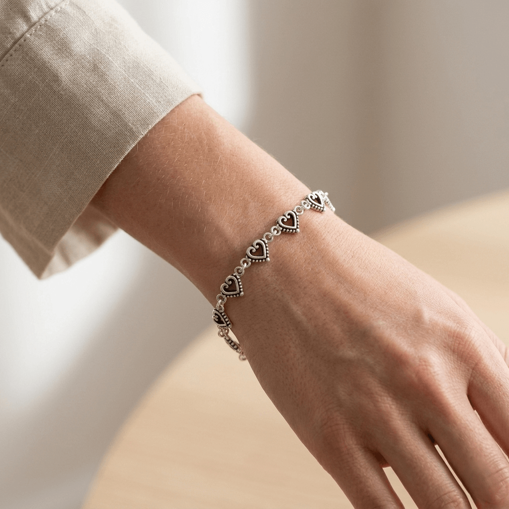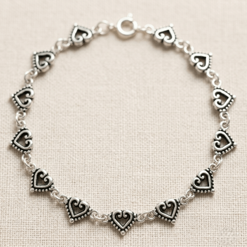 A Pulseira Elo de Corações Rendados é uma joia que une o simbolismo clássico do coração a um design rico em detalhes. Esta pulseira é composta por elos articulados em formato de corações vazados, apresentando um acabamento rendado e oxidado (estilo envelhecido) que ressalta cada curva do metal.