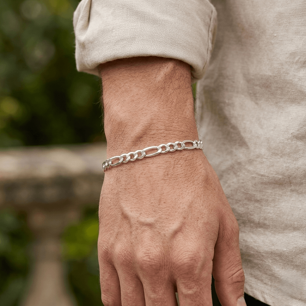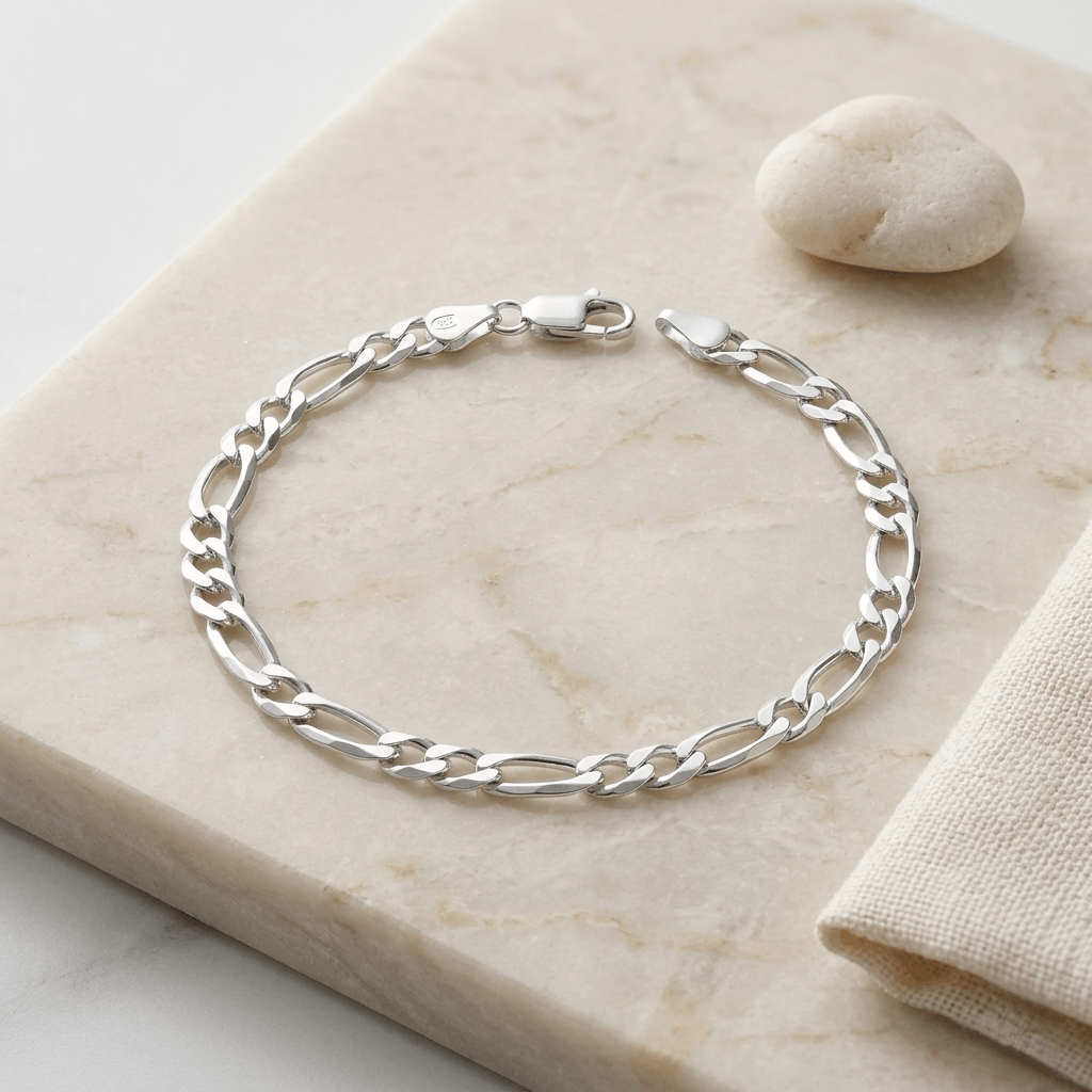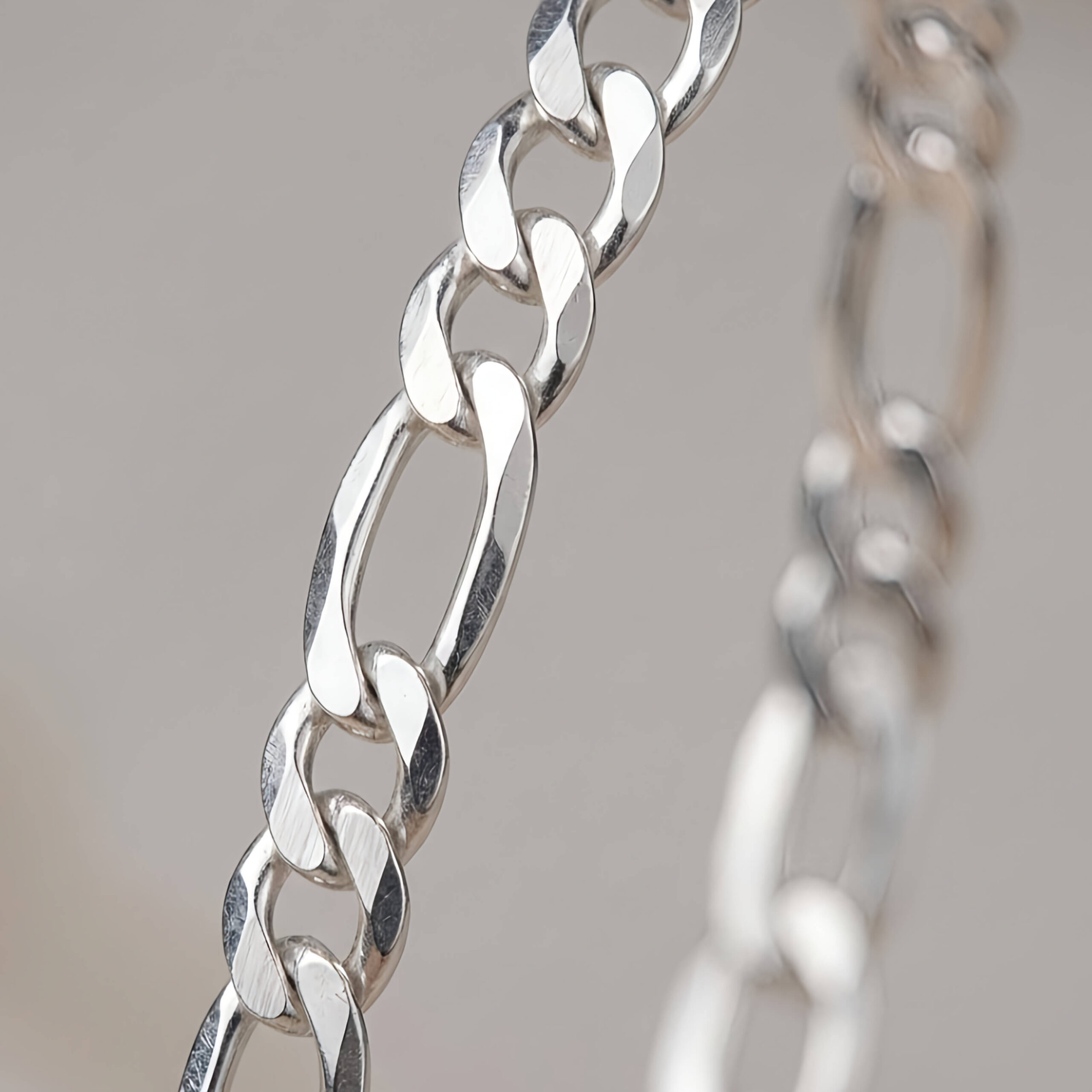 Pulseira Italiana Malha Figaro da Pedranel é a escolha perfeita para quem busca um acessório versátil e marcante. Confeccionada em Prata 925 legítima, esta peça apresenta o tradicional design de elos 3×1 (três elos curtos seguidos por um longo), garantindo um brilho excepcional e um caimento impecável no pulso.