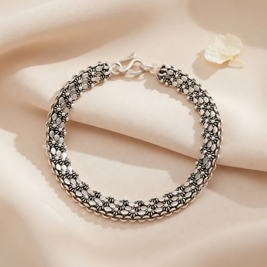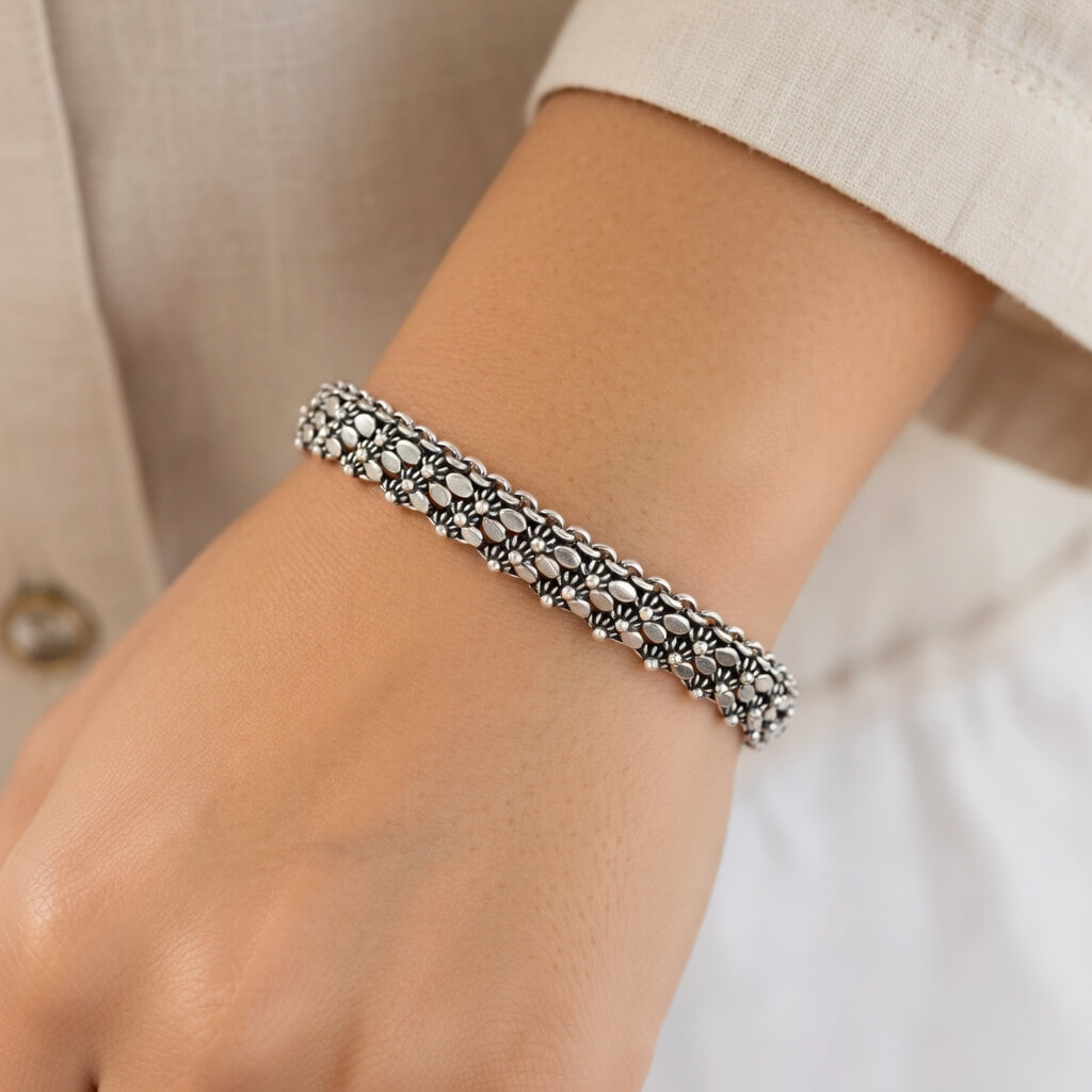 Pulseira Luar de Bali Envelhecida, inspirada na rica cultura da ilha de Bali, esta pulseira da Pedranel é uma verdadeira obra de arte em Prata 925. Sua trama meticulosa apresenta padrões florais e geométricos entrelaçados, destacados por um acabamento envelhecido (oxidado) que confere profundidade, textura e um ar de joia vintage única.