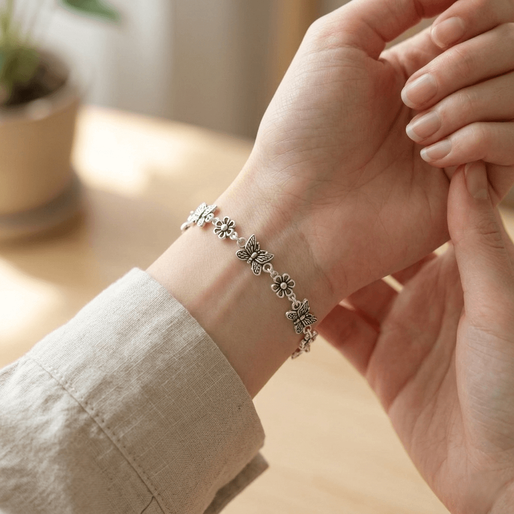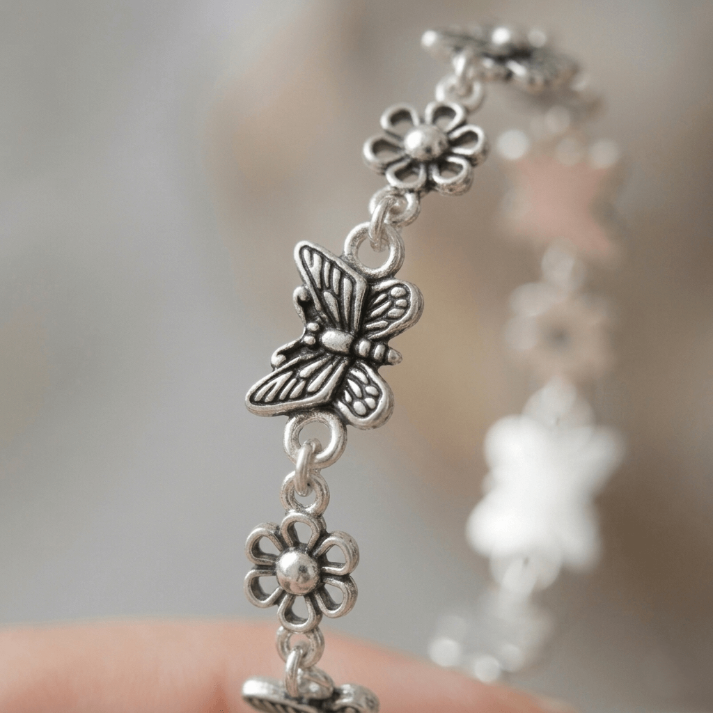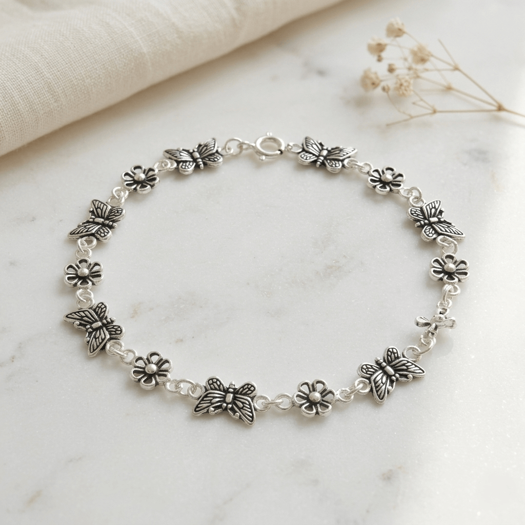 Pulseira Lumina Garden é uma celebração da liberdade e do florescer. Confeccionada em Prata 925 legítima, esta joia apresenta uma alternância encantadora entre borboletas detalhadas e flores delicadas, criando um design que remete a um jardim iluminado pelo luar.