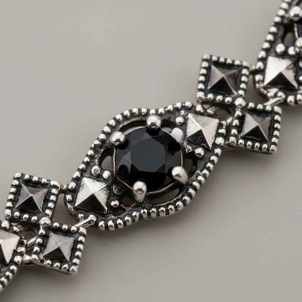 Contraste Magnético: O brilho lapidado das marcassitas envolve delicadamente as pedras centrais, proporcionando um visual luxuoso e clássico.