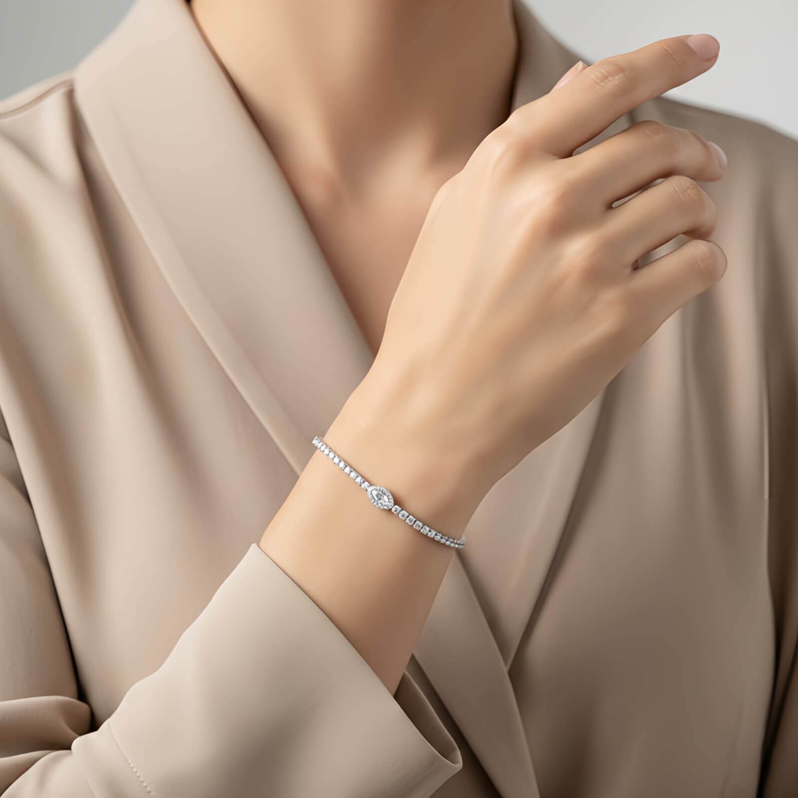 Pulseira Riviera Premium em Prata 925 é uma joia clássica e sofisticada, composta por uma sequência contínua de cristais lapidados que proporcionam brilho intenso e acabamento refinado. O destaque fica por conta da pedra central em formato gota, envolvida por delicada microcravação, agregando elegância e exclusividade à peça.
