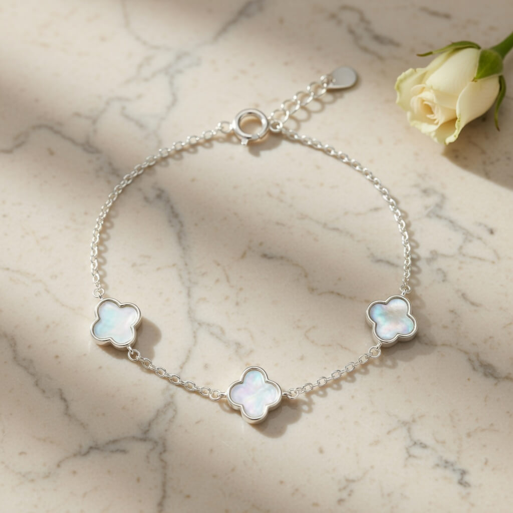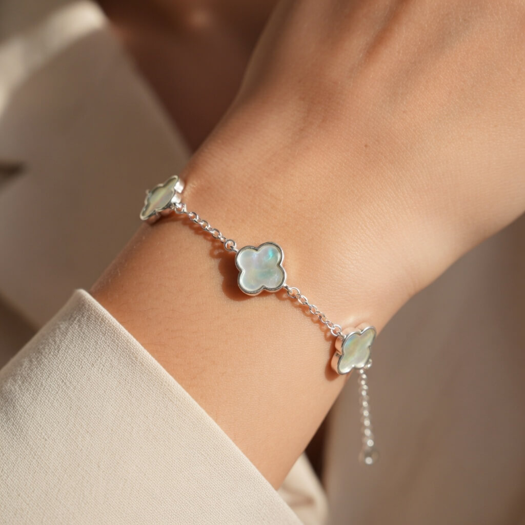 Pulseira Trevo de Madrepérola, símbolo universal de sorte e sofisticação, esta pulseira em Prata 925 une o brilho eterno do metal nobre à delicadeza iridescente da Madrepérola natural.