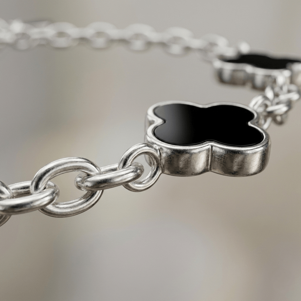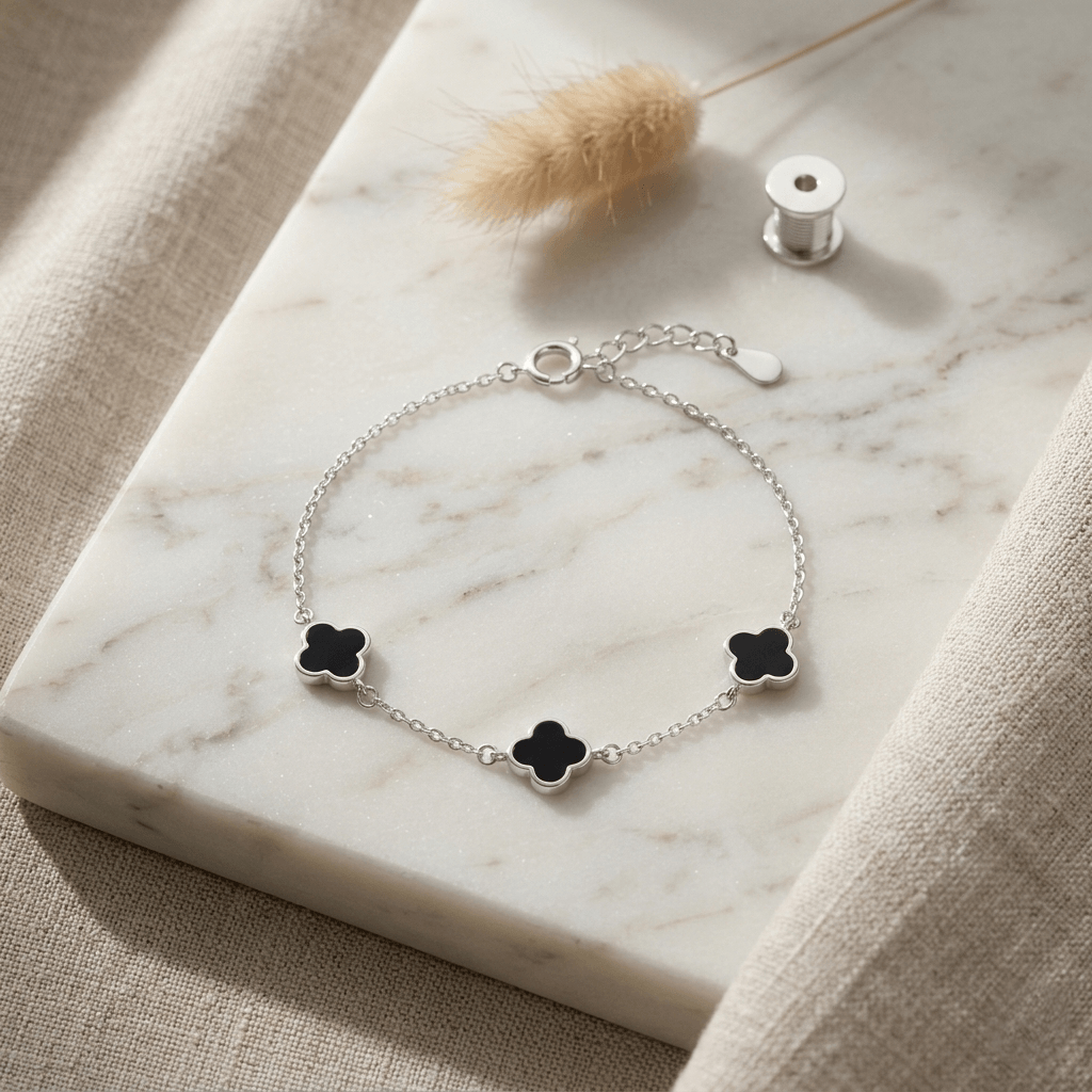 Pulseira Trevo Noir Black, uma joia que une o simbolismo ancestral da sorte ao design contemporâneo. Confeccionada em Prata 925 de alta lei, esta peça apresenta uma corrente de elos delicados que sustentam três trevos em resina preta profunda, criando um contraste magnético e luxuoso.
